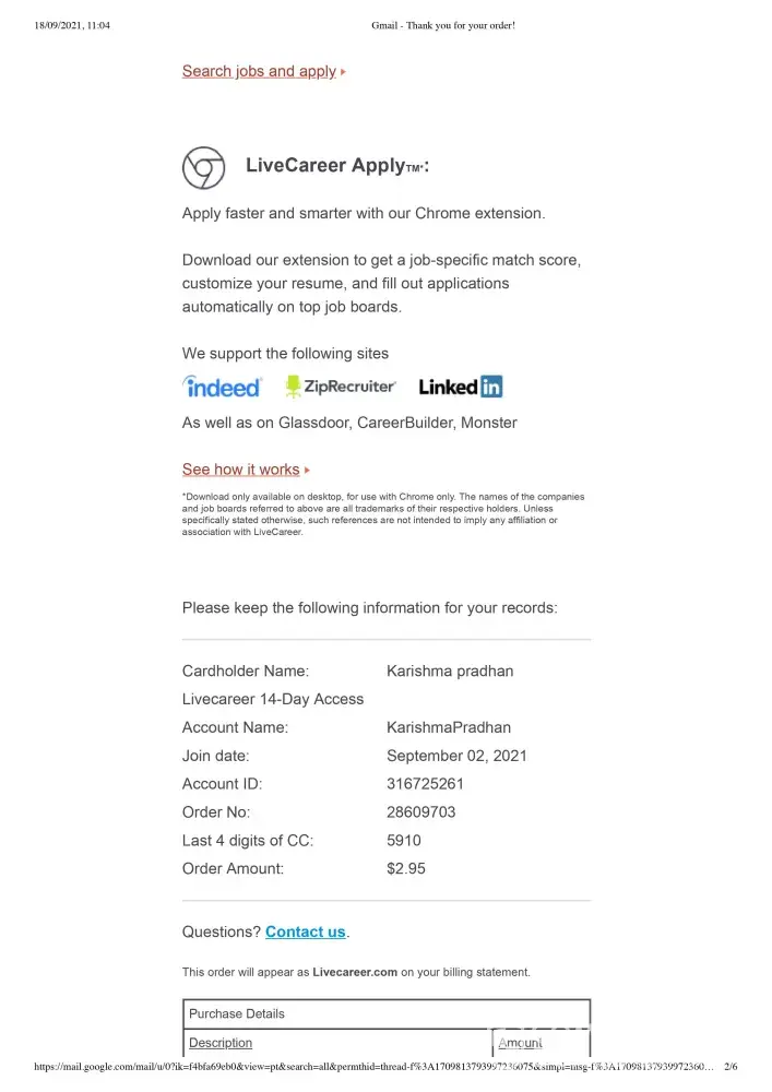 I would also like to make a complaint about the customer service associate Warren (I was told his name was Warren and he is located in California which I am not sure whether was a lie), who told me LiveCareer as a business will not provide any receipts, because customers can check their subscription notice (there are no such notices on the website, and even there was one it was merely a blank contract without customer's agreement to pay any amount more than $2.95), or credit card bills (which are NOT receipts either). Customers' credit cards are not supposed to get charged without consent.