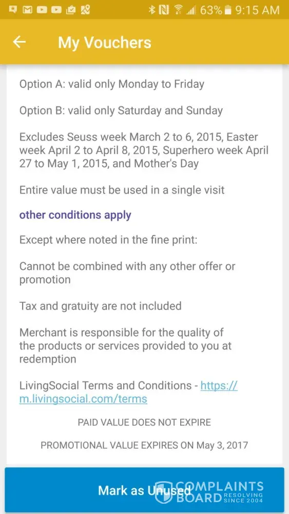 I am so disappointed with your lack of customer service and your error on my voucher. I purchased a voucher back in 2015. I realize that was a while ago and that when you are out of the promotional date of the voucher you only get the paid value. Here's the issue, at the bottom of my voucher it states that the promotional value expires on May 3, 2017. When I called Living Social about this they stated that it expired before that and they can do nothing for me. So last night I choose this restaurant based on the promotional value. I honestly would have called and asked for a credit and not have went to the restaurant if I realized that I wouldn't get the promotional value. I spent a lot of money there and thought my savings would be worth it since the voucher stated the promotional value didn't expire until May 3, 2017. I contacted Living Social and the customer service representative was rude and didn't care to hear anything I had to say. He just kept saying that it expired and I therefore get the paid value. Which I realize is how it usually works but being my voucher had a date of May 3, 2017 I should be credited or compensated that difference. I offered to email my voucher so he could see it. He didn't care to work with me one tiny bit. I said cancel my account and remove me from any emails. I can't believe how this customer service representative was acting like it's money out of his pocket, not even an apology for the confusion. I don't know how they are still in business, never had these problems with groupons. I included a screenshot of the voucher so someone can at least see what I am talking about being the customer service representative was not one tiny bit interested in what I was saying.
