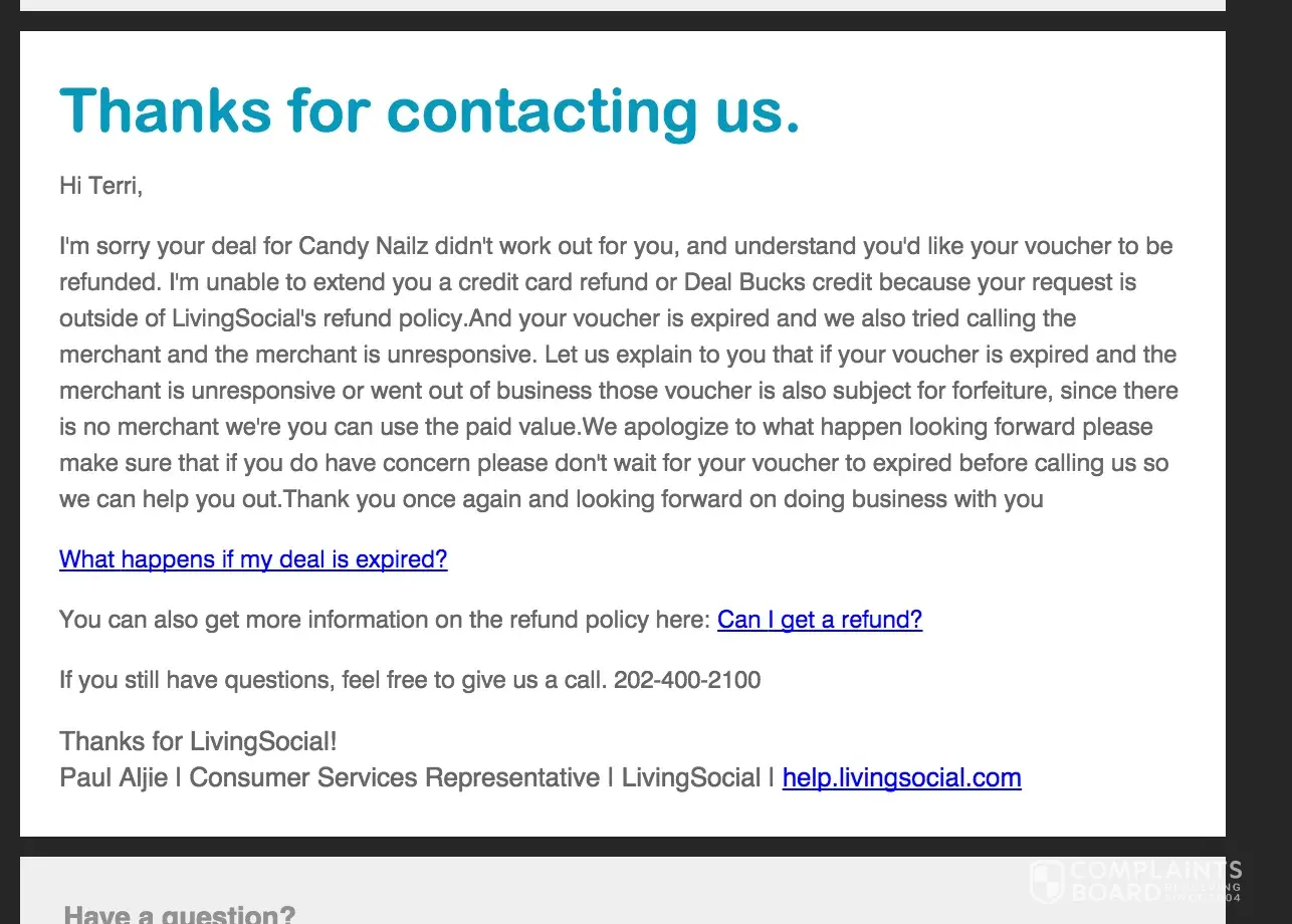 After being on hold for over 40 minutes, Living Social wouldn't even listen to my complaint. They said they have no responsibility what-so-ever. I asked to talk with the manager and they said she might call me back. They don't even have an email that you could use to direct complaints. I certainly won't be using them again with companies that I'm not familiar with. Buyer beware!