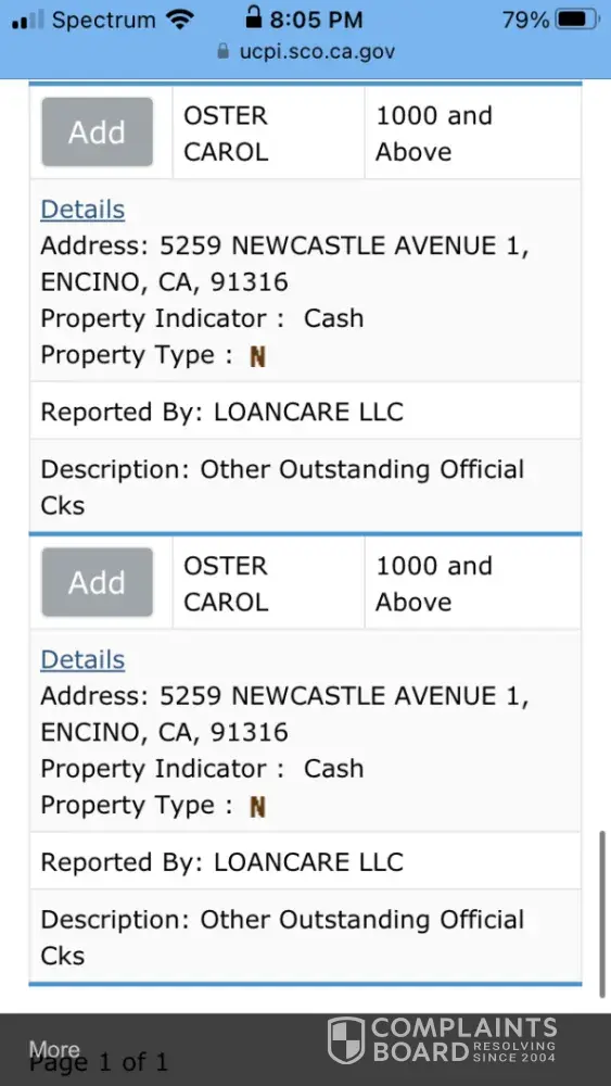 My mother passed away in October of 2019. We checked in the state controller’s website and it shows 2 separate postings for my mom. We spoke to someone at LoanCare. We were instructed to send Mom’s info, death certificate, will showing that I am the heir and a picture of my drivers license. Two days later they sent an email saying that they couldn’t find anything. If they would just look at the state controller website, they would see their name.