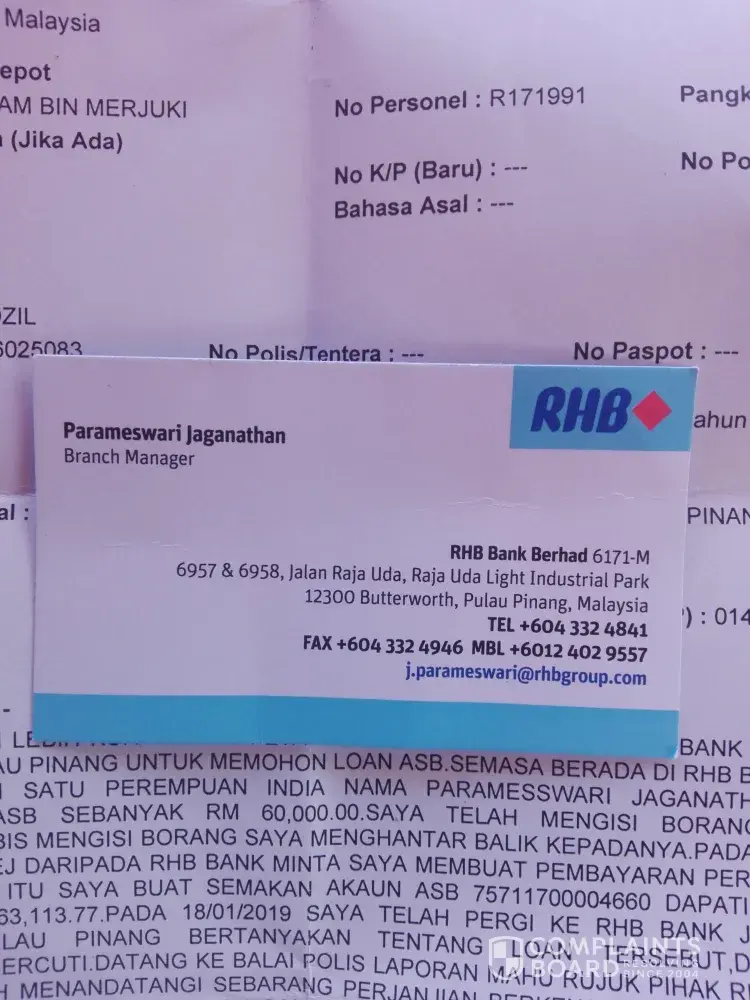Read full complaintRhB Bank Berhad Raja Uda Butterworth - asb loan rm 60.000