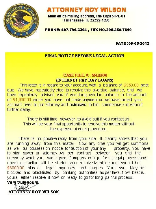 Read full complaint and 5 commentsRoy Wilson, Atty - Law suit for payday loan