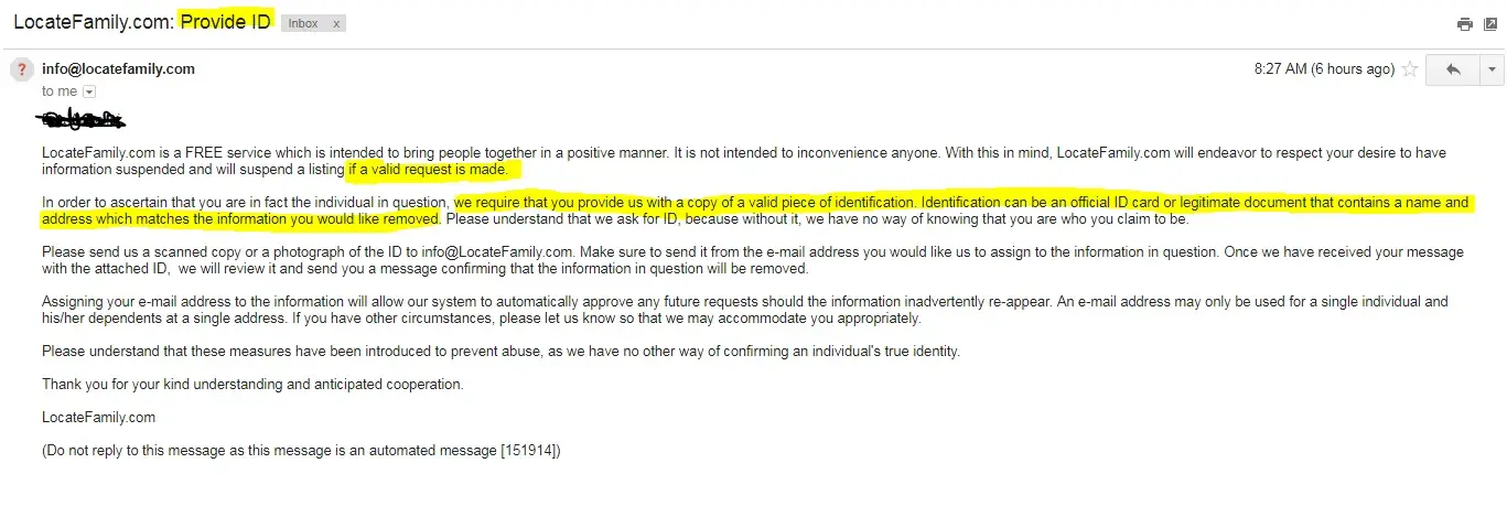 However, locatefamily.com will refuse to remove any information from their site unless the user provides them with more official records of their sensitive data such as photos, drivers licences, and utility bills. (Chances are they take these photos and sell your licence on the dark web).