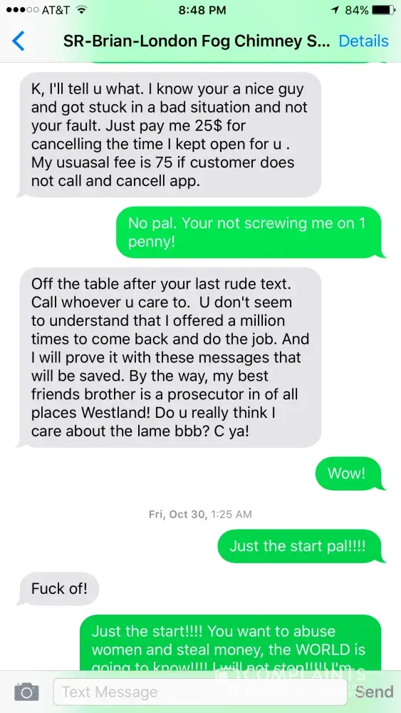 BEWARE! Do NOT Do BUSINESS with LONDON FOG CHIMNEY SWEEPS in LIVONIA and its owner BRIAN MILLER FROM ANN ARBOR is my strong suggestion! I called Brian Miller, the owner of London Fog Chimney Sweeps to go to one of my rental properties to conduct a clean out and chimney report for the city. He told me it would cost $110.00. Instead of waiting until the job was completed (as I should have), I mailed him a check that day for the work yet to be done. The problem is Brian the owner of London Fog Chimney Sweeps would never call the tenant to schedule the appointment to do the work. I constantly had to call him and play nice trying to get him to call the tenant, as he already had my money. He always had some excuse as to why he had not called her yet to set the appointment. Finally after 6 different calls, I persuaded him to take a time out and schedule the darn appointment. He told me also that he had not yet received my check. I knew that was not true. I called my bank to verify if the check was cashed and YES it was cashed by him! I called Brian back and told him it was cashed and he acted all dumb. On the day of the appointment he was asked by the tenant to call her before he showed up, so she would have a heads up. He did not. He just showed up, and the tenant was not there yet. Instead of calling the tenant or calling me, Brian just left instead. That’s assuming he even went there to begin with. Next thing I know the tenant called Brian and Brian degraded her and yelled at her over the phone. Not how you handle a women or a customer! My tenant called me almost in tears as to how she was just spoken with. I called Brian on 3-way phone call with her and when he answered, he was very rude and said “get her ### off the phone, hang up on her, I don’t want to hear her crap anymore!†I COULD NOT BELIEVE he spoke this way to my tenant, a women and customer this way!TOTALLY UNEXCEPTABLE! I called Brain later that day and told him I just wanted a refund of the $110.00. He refused to refund the money. He said he would schedule for whenever he could come back. I told him that was not going to happen. The tenant no longer wanted him back in her house. Neither did I. I don’t trust him now anyway. He refused to give my $110.00 back. Through text messages he just continued to write that he was not wrong and she was, and he will schedule the job and not give the money back. He failed to understand that once you verbally abuse a women/customer, you cannot expect them to let you in their home. I told him it was not going to happen and if he did not give me my money back for the job that he did not do, I would sue him. He did not care; he taunted me to do so. Finally after going back and forth, he offered to keep $25.00 of my money and give back the rest. I said no to the sleaze bag and said you’re not going to get away with stealing 1 penny of mine. I told him if I have to sue him I will, over $110.00. I told him I would contact the BBB, attorney general, news…..Brian than text back and said: “By the way, my best friend’s brother is a prosecutor in of all places Westland! Do you really think I care about the lame BBB?†Than Brian Miller sent me an email that read this: “Since u declined to have us do your work, we enjoyed a very nice expensive dinner on your sorry ###. FYI, the authorities have been notified about your harassment. Keep it up f_ck head!†Can you imagine doing business with a man that represents a company speaking like this to the public? He obviously has issues and I would caution everyone, especially women to be very careful speaking with this man! Regardless if I am successful in collecting the $125.00 this company has flat out stolen from me, I would caution anyone that reads this NOT to do business with London Fog Chimney Sweeps and tell all their loved ones that may be in the market for these type of services to beware of Brian and his scam of a company! I have attached screen shots of his texts and mine. You can see he just continues to point the finger and say he is willing to do the work now, knowing she will not allow him in her home, so this is his way to try to “look right†while he is stabbing me in the back by stealing my money! Let's be honest, what women would let him back in her home? Not an option after he yelled at her and almost brought the poor lady to tears. Brian Miller tries to live on his name from yesterday, but today he is just a bully towards this women and a thief by stealing flat out stealing $110! How do you not return the $110 when you did nothing! You can't justify it! Also, if you do have Brian Miller out to your home, he will have his dog running all through your home without asking. Do NOT do business with LONDON FOG CHIMNEY SWEEPS is my strong suggestion. The have been in business for a long time, but they are not signed up with the BBB or Angies List, which says a lot! They would rather not have bad reviews so Brian Miller just did not join! They have 2 addresses. 1 is located at 18001 Lathers St., Livonia, Mi. 48152.----Phone number [protected] or [protected]