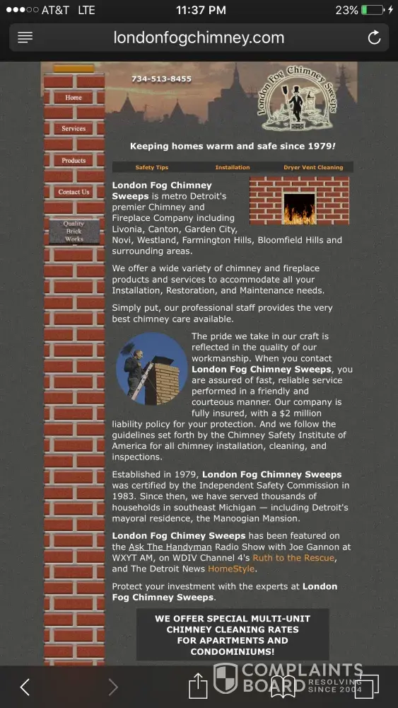 London Fog Chimney Sweeps’s earns a 1.0-star rating from 0 reviews and 1 complaints, showing that the majority of customers are dissatisfied with chimney cleaning services.