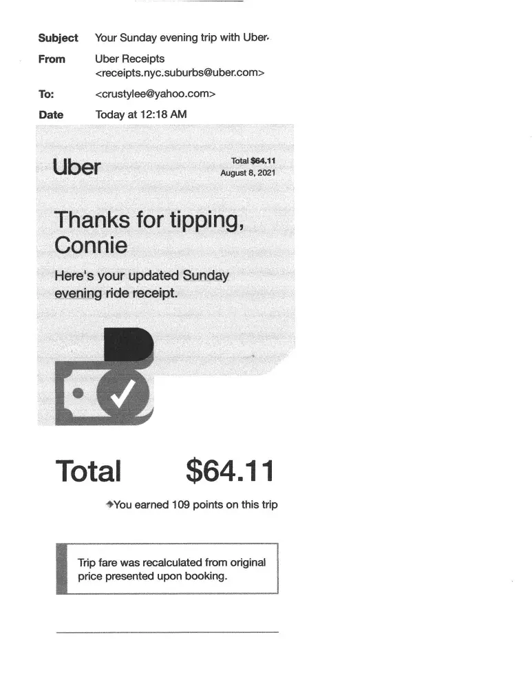 Desired outcome: I want a refund for the ticket LIRR $12.00 and for the Uber $64.11 Total $76.11