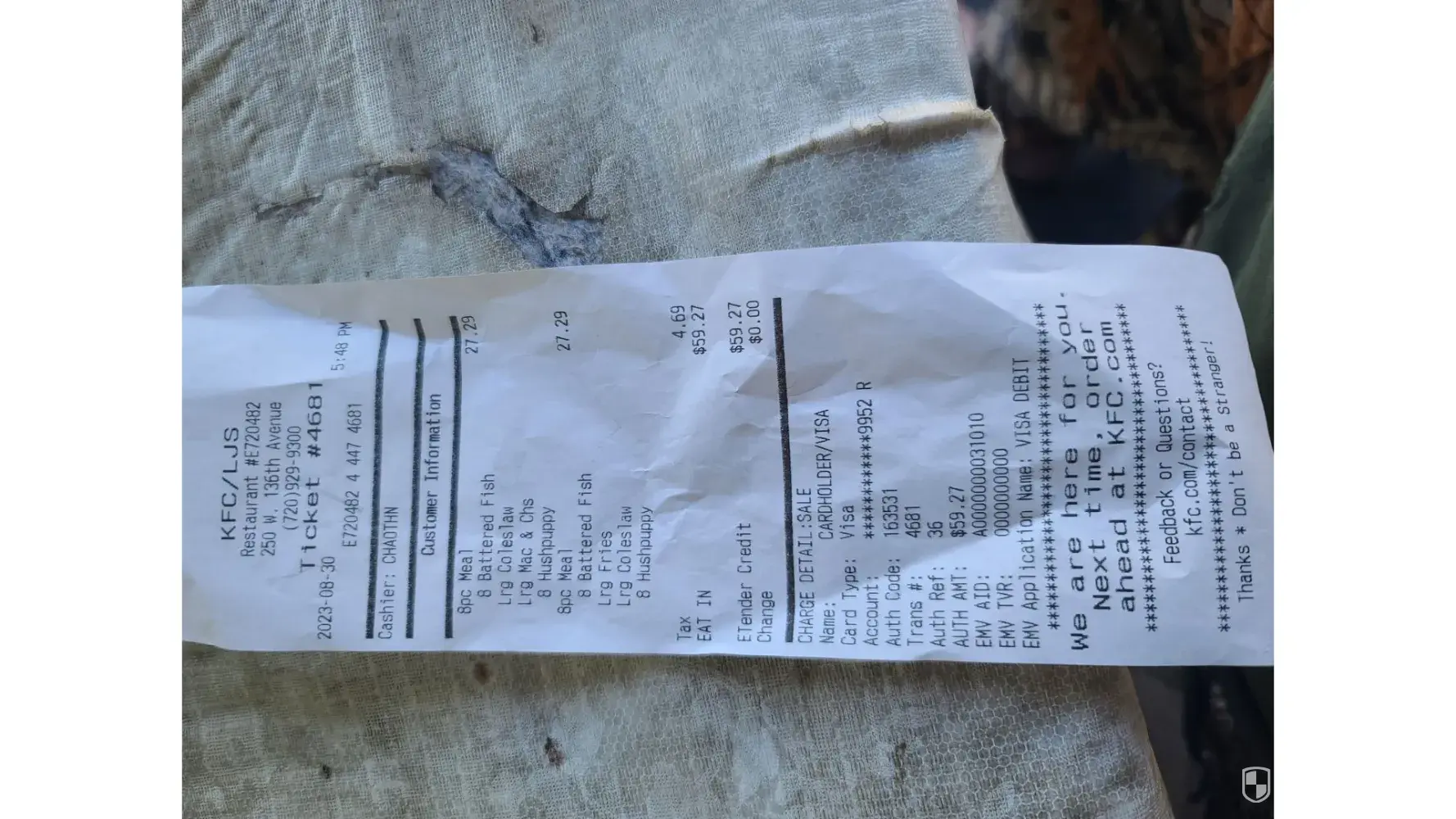 This was 7.21.2023 7:05PM Cashier Kimberly. One of the 2 pc fish meals came out with fries on the bottom, very greasy fish on top. It looked like someone else had retd it and we were lucky enough to receive. The 2nd 2 pc fish was hot and no issues. Also ordered 15 piece grilled shrimp & coleslaw. Shrimp Just dumped in black container and look like it needed...