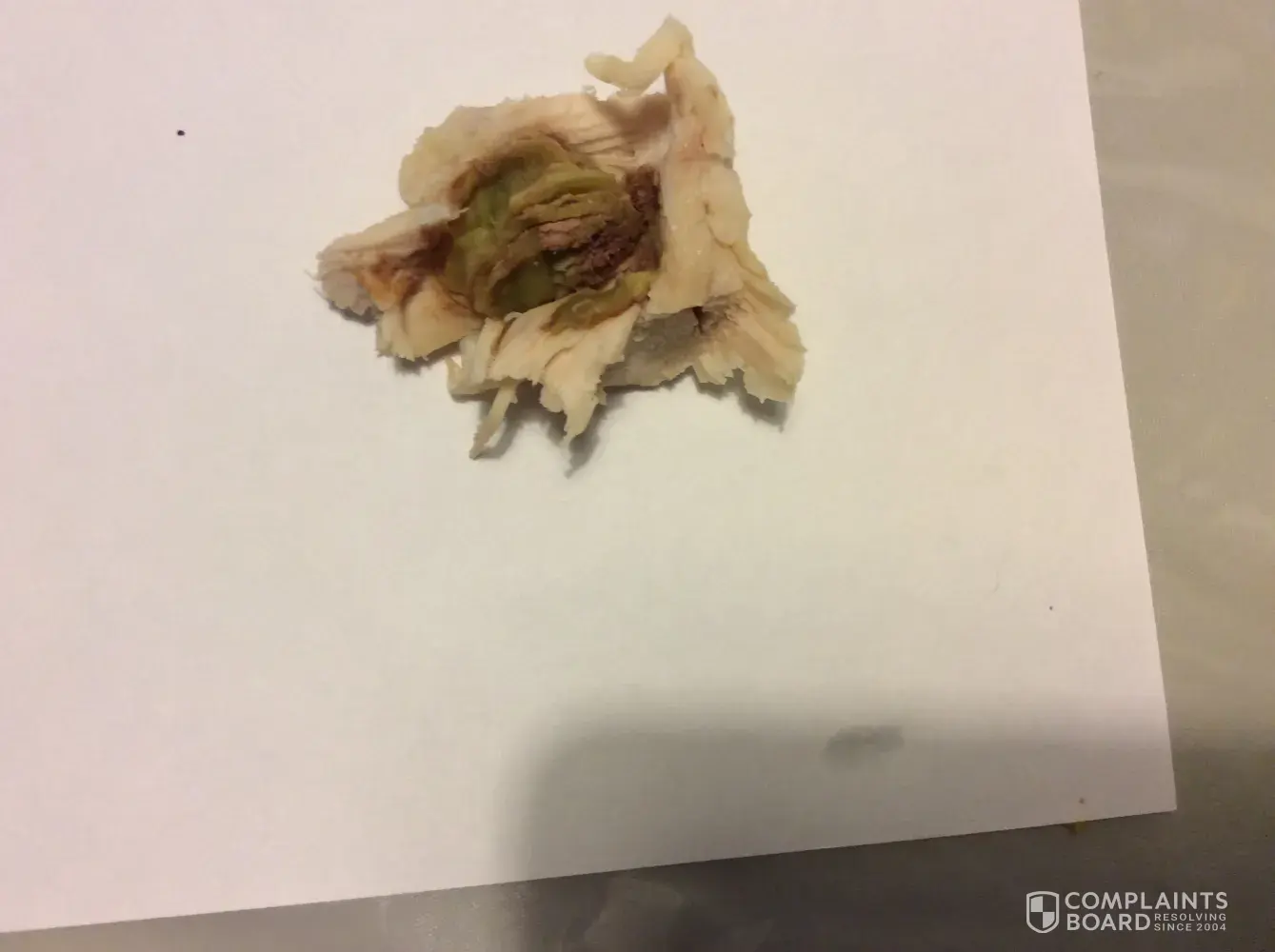 On September 28, I bought 2 chicken meals from Long John Silvers, Hermitage, PA. I get food from there at least twice a month. This is the first time I have an issue. On 28th I put the leftover pieces in the freezer. Today when I was eating them, I saw a dark streak in one of the pieces. I cut it open lengthwise to see what it is. I saw some disgusting thing inside. I don't know what it is. It is dark green with layers and about the size of a nickel. I took pictures. I am posting them here.