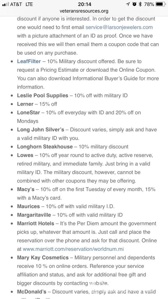 I visit Longhorn at least once a week. It has become one of my favorites. I have always been given a military discount. This particular night at the McDonough, Ga location, I requested to have a military discount and provided my ID. The waitress and then the Manager said they do not offer this. I pulled it up online at Veteran source.org to confirm that Longhorn is in fact a place that offers this.