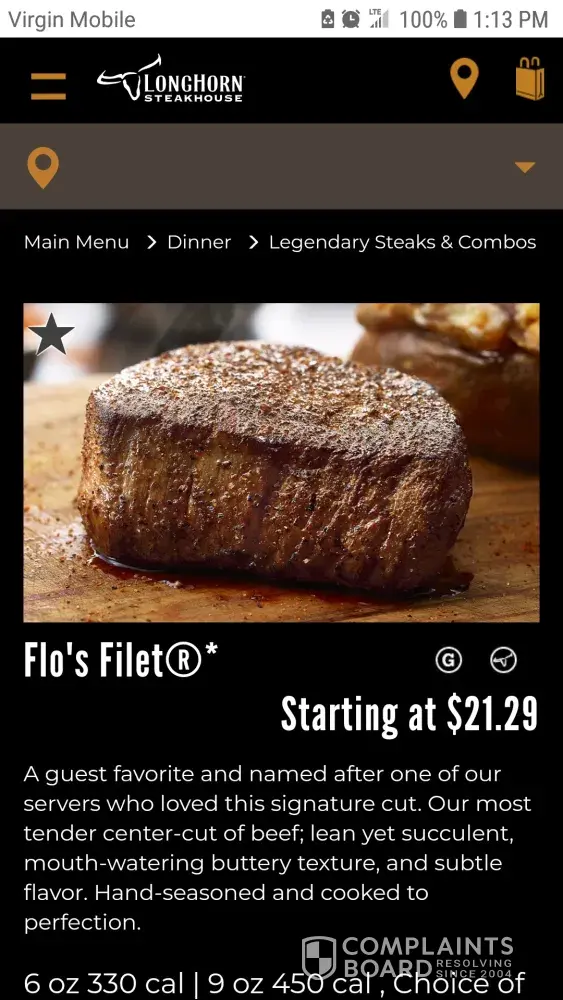 I try to never complain, but this crap is inexcusable... They are ripping us off on curbside orders... Has happened 3 times I am sick of it.. The 9oz flo's filet was not what your picture represents... The nice filet in picture #4 was what I had expected... However,. I received this tough, overcooked and (probabaly a sirloin cut, from the looks of it) that was totally inedible. I could not even cut it, much less chew it... This cook should be fired. The broccoli sprouts as you can plainly see were a hot, burned, smelly mess, inedible as well. Whoever you had cook and serve this meal should be fired immediately.