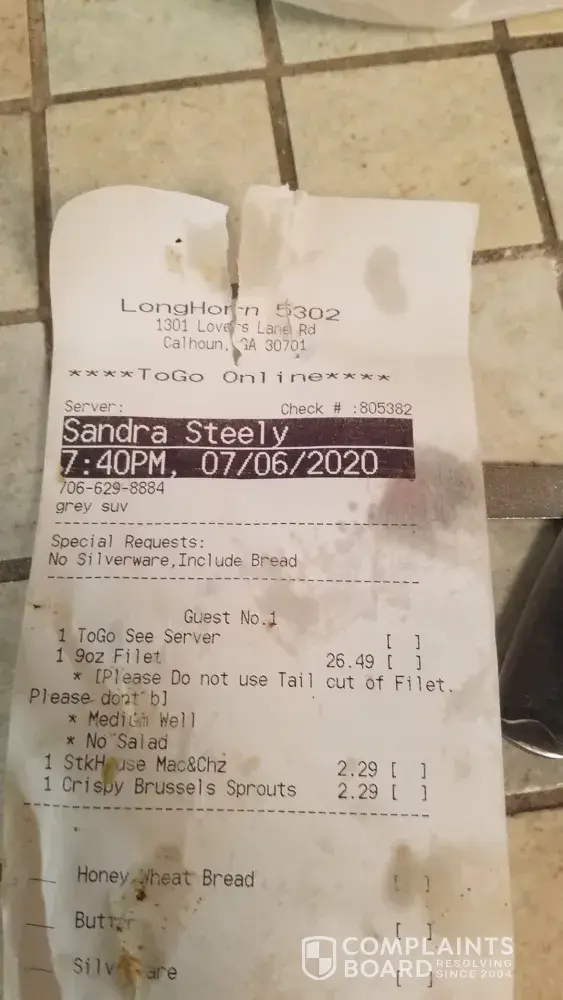 Me and my husband can not afford to go out much and we love long horns its where he proposed so its special anyway we ordered a ribeye cause its says juiceous steak and a salad and potato and I got salmon, when our food came the steak was too done and was not what you would expect from a ribeye we did not want to complain cause we know they would throw it out and we dont like wasting food, we ate our dinner with salad plates still on table really was disapointed I told the server when she came to get the check but no managment came over also we had grilled mushrooms which looked awful so we wanted to let someone know cause right now its hard to go anywhere and when you do you are bummed thanks for lisetening I know the bill was only 60.00 but thats alot for us, we dined in the dawsonville ga location