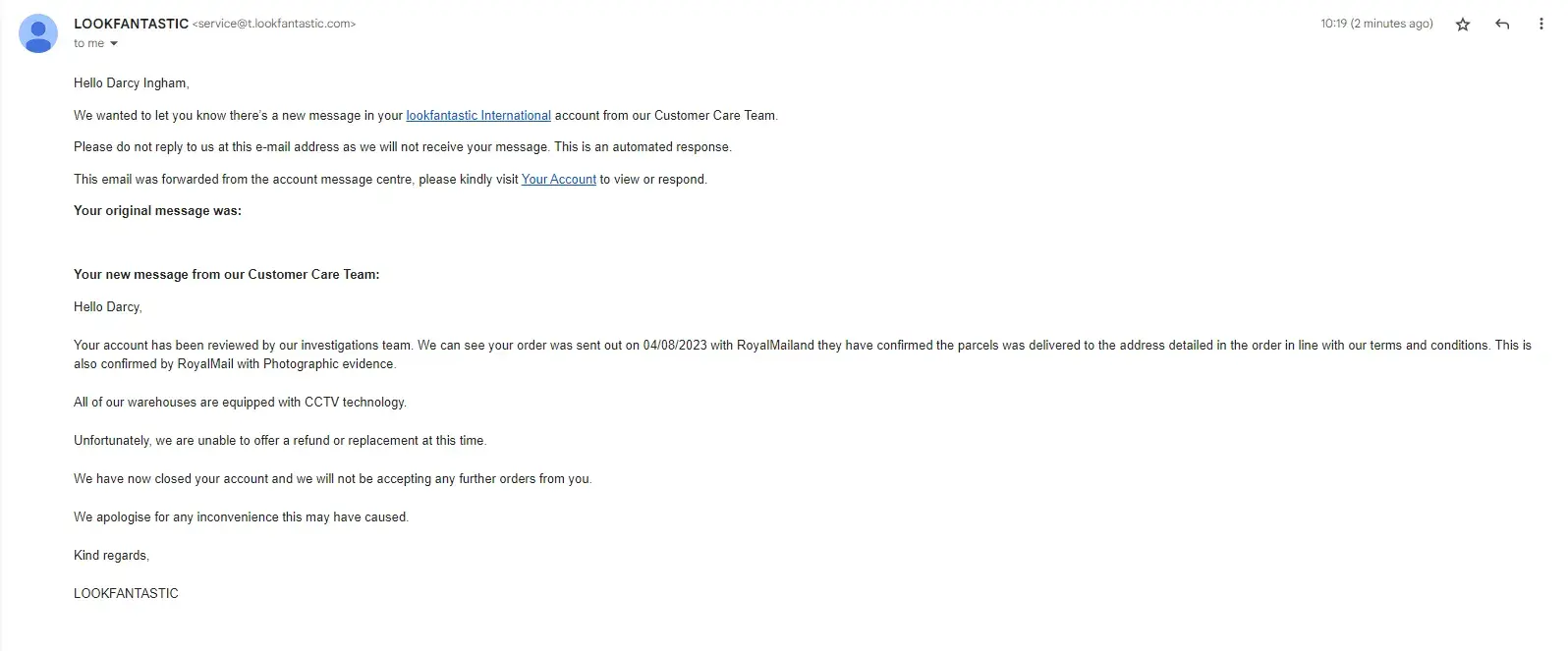I made a purchase from Lookfantastic on 24/11/2023. The order was divided into 2 different packages. I got the first one but not the second. There is no tracking information and therefore I contacted them by mail. As a result they deleted my account and said they are no longer shipping to my address. I have been nothing but patient for more than a month. They did not tell me if they are going to send my money back or a replacement. They just decided to delete the account of the person who paid for something they never got. As my account is deleted I have no way of contacting them or checking my orders. I'm just looking for my rights as a customer who just lost both her money and her account for absolutely no reason.