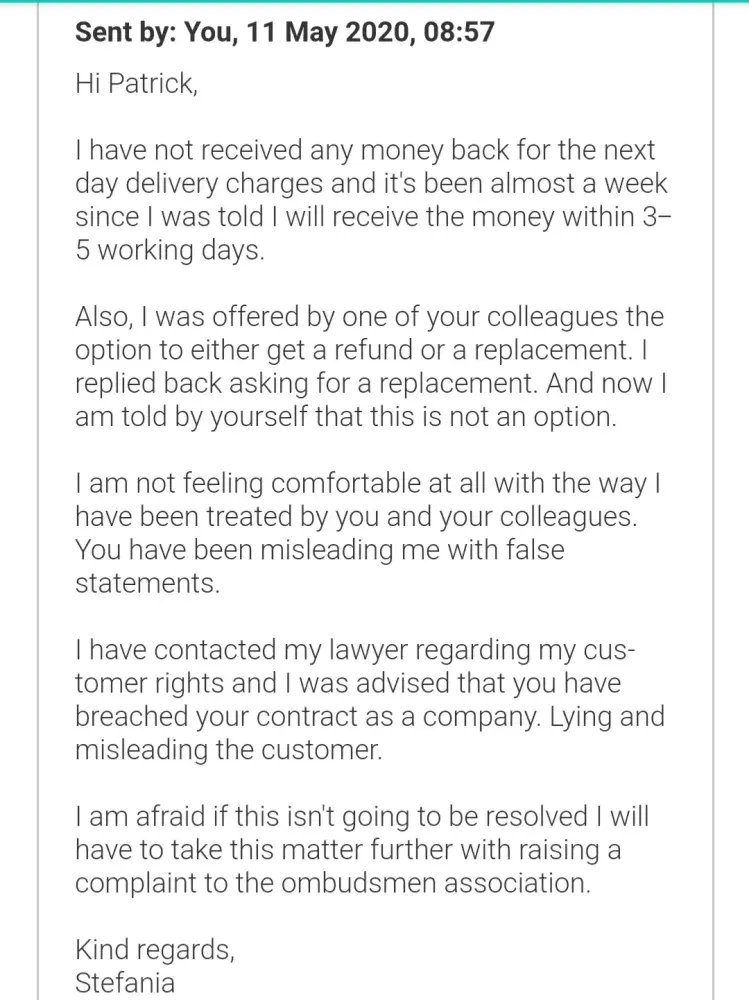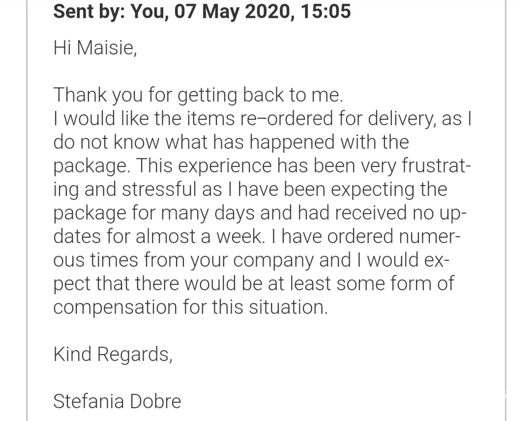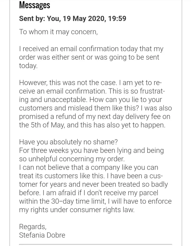 They have been lying to me and have misleading me. One time they tell me that they have dispatched the package and is with the courier and they investigating what is going on. Next thing they send me an email telling me tha actually my package is going to be sent after yesterday (19/05/20) and they will update me with a tracking number.