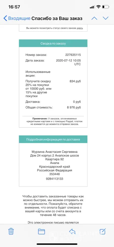I Murzina Anastasia, July 12, 2020 paid 100% of the Order [protected] from July 12, 2020, the product on August 10 was not transferred to the transport company for subsequent transfer of the product to the customer and the company does not return money for the product .There is no product and no money