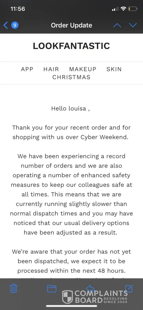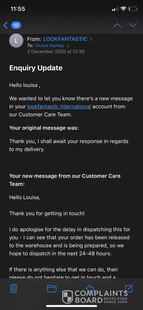 I then received 2 emails stating there was a problem with my order and no specifics as to what the issue was. I then received an email saying my ordered had been cancelled due to a pricing error on look fantastic' end, with no further information as to why. I made a complaint via Twitter and then had to follow up more than once before anyone responded.
