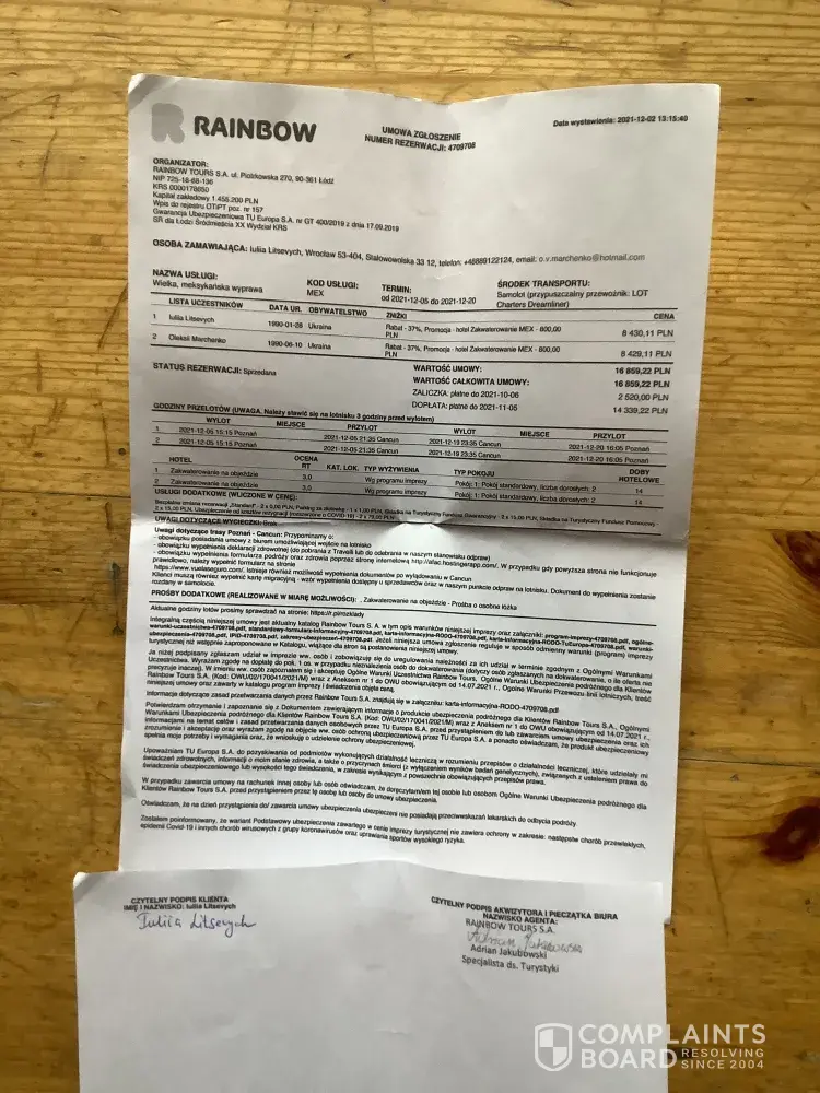 Date 19.12.2021, Iuliia Litsevych, case number RP/15643/21/MIB, the flight number LO6534 was 3 hours delayed. I would like to request a refund, the agreement with travels agency is attached.