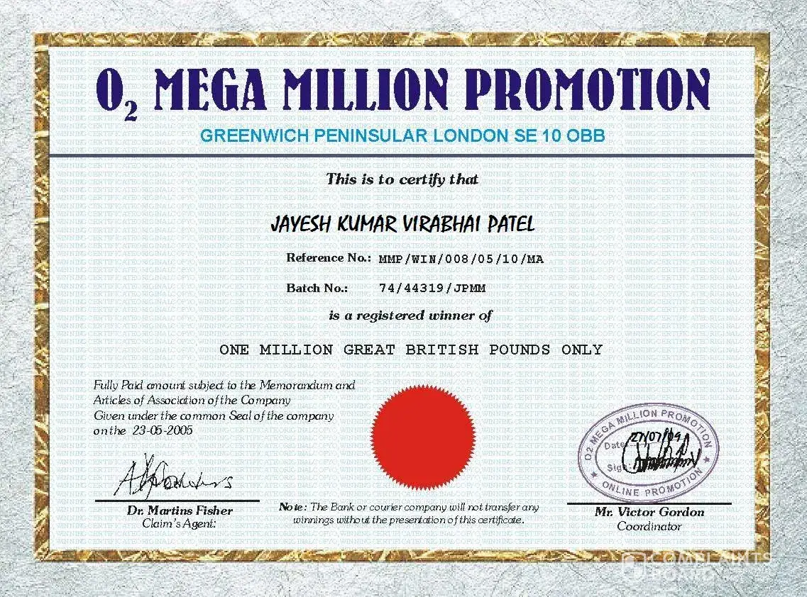 Dear, Sir. First of all i received SMS on my mobile that you have won ONE MILLION GREAT BRITISH POUNDS in o2 Promo draws.To claim your funds send your NAME, ADDRESS & PHONE NO to V.GORDON via email : [protected]@hotmail.com I send all above details then he reply me & ask to send VERIFICATION FORM & ID PROOF. Again i send these informations with my PAN CARD'...