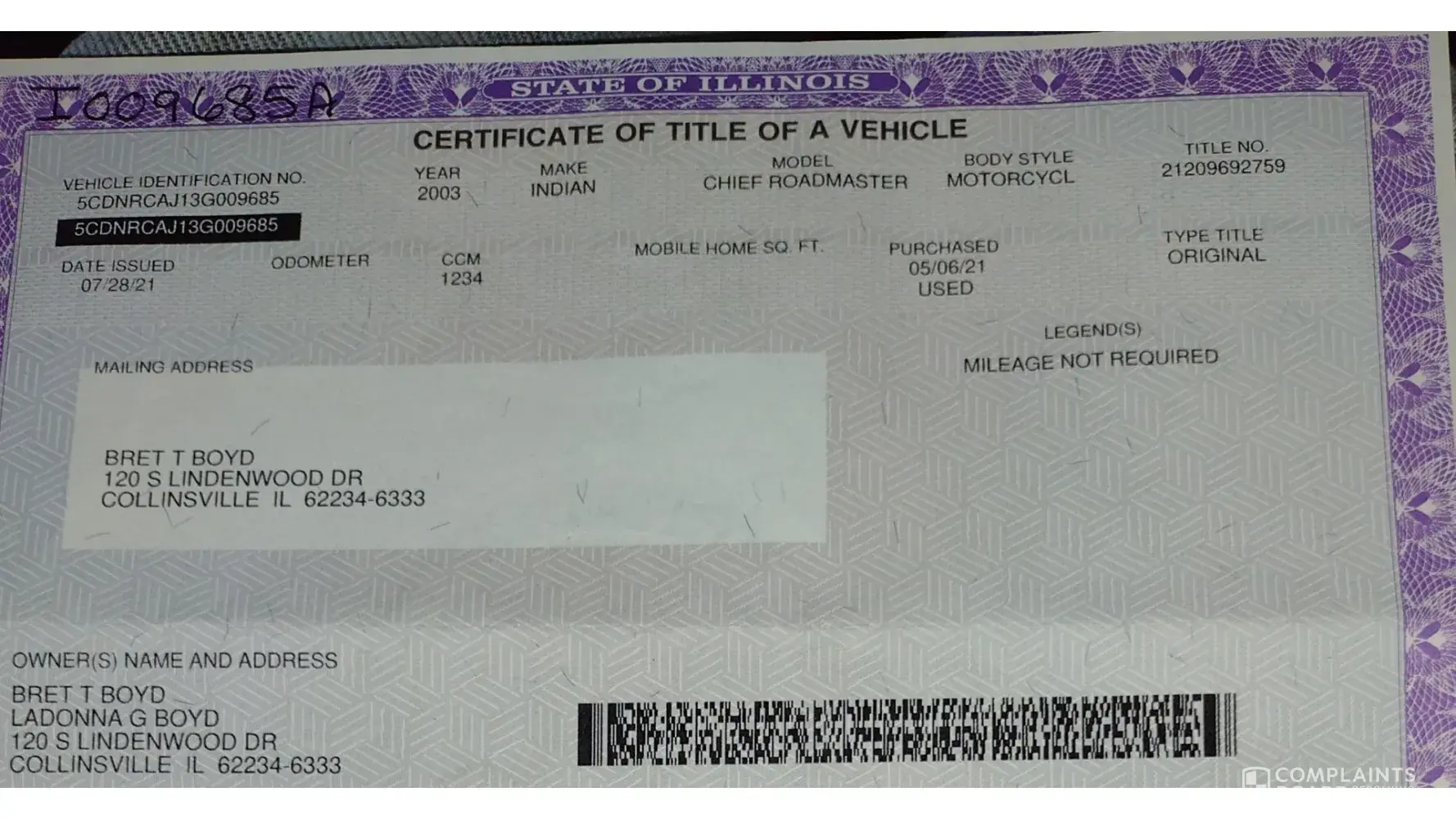 On arrival nothing was ready and it took over an hour to get paperwork done. Of course I expect to get the normal you should have checked it out better before purchase. I couldn't even put a leg over it because of surgery and after the drive and extra time there the motorcycle could have been pink with poka dots and I wouldn't have noticed. It was after getting home and then getting title that I noticed everything he had stated in the email was total lies. According to title the previous owner had the bike less than 2 years and when key is first turned on odometer reads over 10,000 miles. As for being road worthy and touring/show capable, rusty wheels and dented lights keep it from being far from show capable. I could have accepted that, but it is also far from road worthy and sits 50 miles from me at a motorcycle mechanic because of knock in engine.