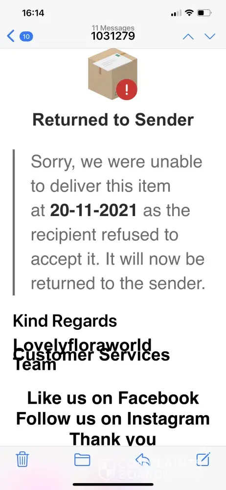 Royal mail has send me a message today, to say delivering on 17 March 2021. I do not want these flowers to be delivered to my mother, I expect a full refund