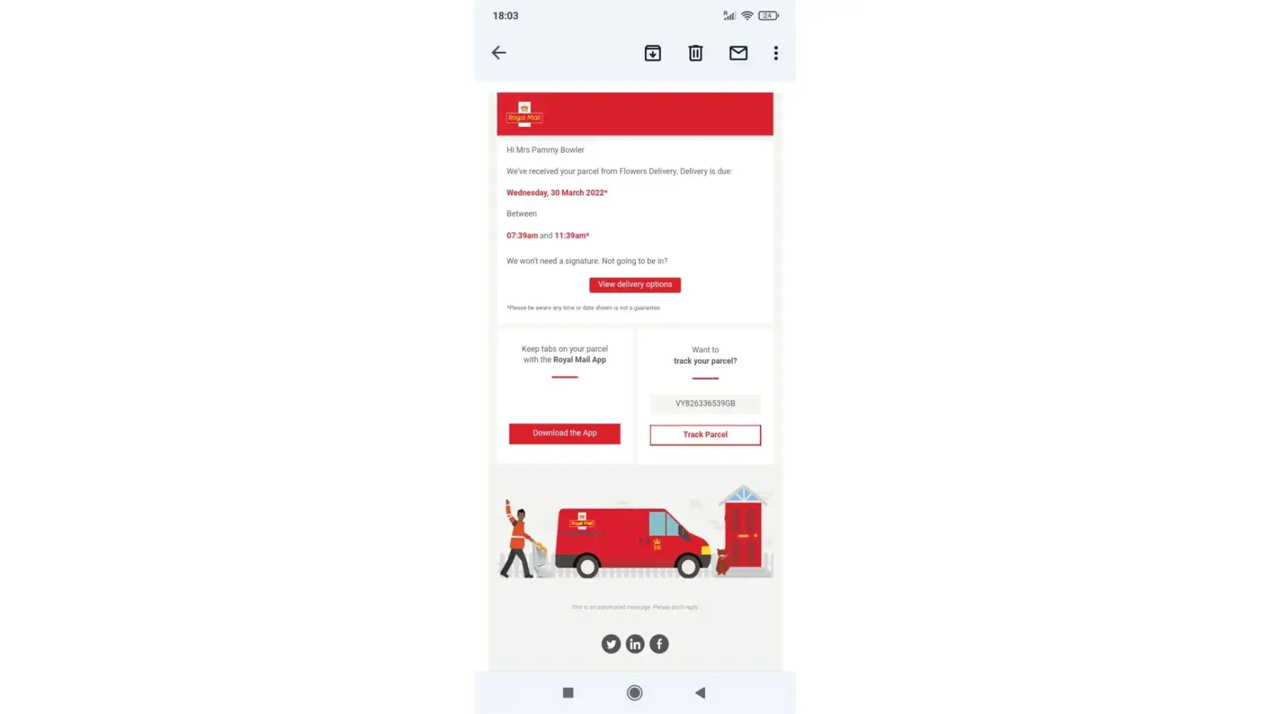 On the day of delivery I received a message from Royal Mail to say they had receipt of the flowers which would be delivered the following day, the day after her birthday!