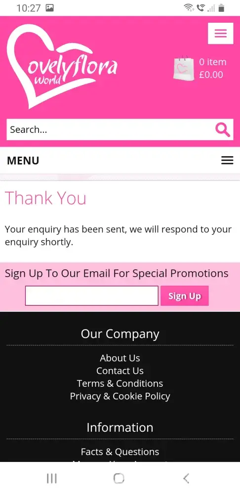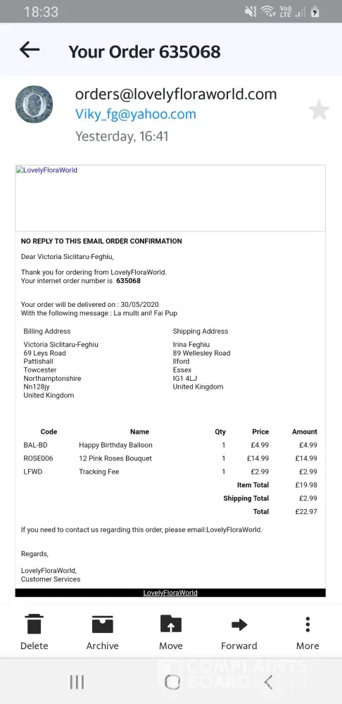 I ordered flowers from lovely flora world online to be delivered on the 21st November 2020. They sent me confirmation that they have picked the flowers and are ready to be delivered on the 21st November 2020. Unfortuntly, they lied and nothing was delivered. I have been emailing them constantly but they have not replied to any of my emails. I will be taking this further as I want a full refund.