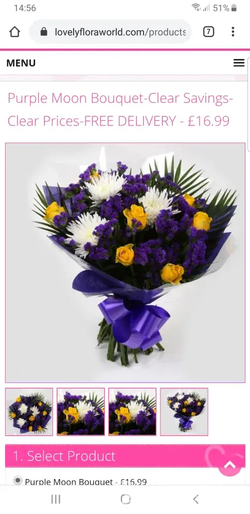 I ordered which I thought was a beautiful bunch of flowers, I paid extra for a extra 50% off flowers, when they arrived they box was lovely (the only thing that was nice) opened box to a very small bunch flowers which I can actually buy for a few pound at supermarket, I immediately contacted this company to say wasn't happy etc send photos as nothing like ones I ordered was no foliage etc lillies were falling off stems, Betty the girl that took my call told me flowers were acceptable as the 50% extra were included in this bunch 14/15 stems I received apparently you get a extra 16 stems with the extra 50% which I certainly did not, would not refund me told me post office would happily return to sender at no cost for me then I would receive my refund, off I go to the post office with box and dying now flowers to be told £6.80 it would cost me, they can only send free if there's a return label, rang again no answer this time, rang this morning again spoke to Betty oh after I'd withheld my number as she wouldn't answer my calls to tell her what the post office had said, again fobbed off I now want to speak to the manager who suprise suprise is not there till next week where the flowers will then be well and truly wilted, I've tried emailing the CEO of the company but again email not in use, this company is ripping people off I'm so angry at being fobbed off again and now going contact trading standards