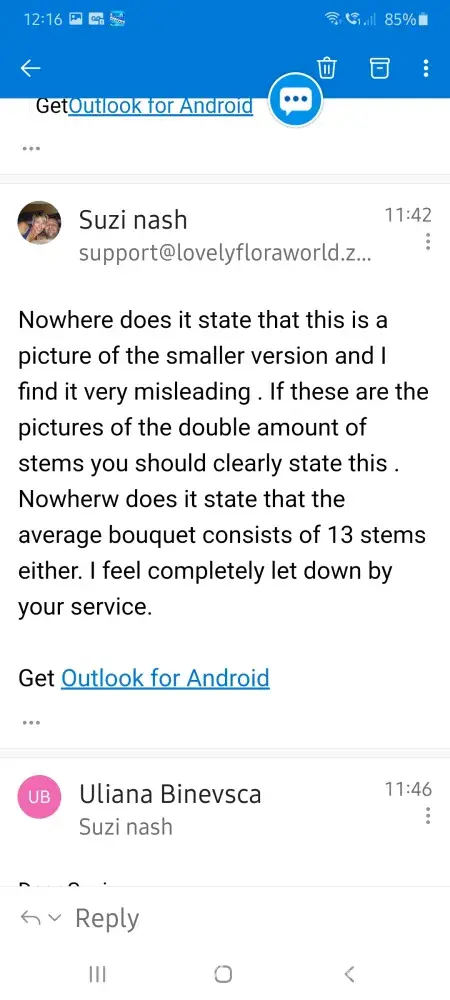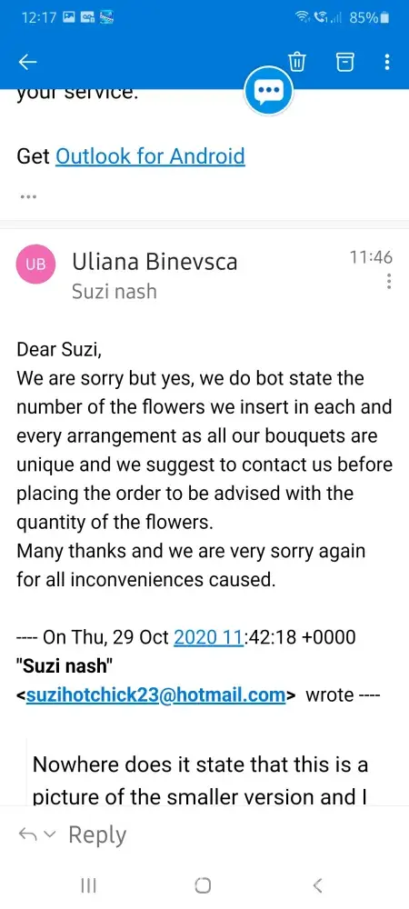 My pictures of communication explain my issues and I am ready to approach Trading Standards for false advertising. Nowhere in the small print does it state the picture of the bouquet advertised us for the larger bunch nor does it state an average stem amount. I understand this varies by design . If that is so then it should be declared in each one