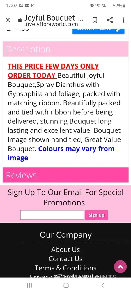 Received a floral delivery from this company. My friend had commissioned them in order to cheer me up on the anniversary of my son's death. On opening the box, I was surprised to note that they looked like any garage bouquet. There was no moist tissue around the stems as is usual with postal deliveries. The heads were drooping and they were withered. It looked as though they had been bought from the reduced bin and tossed in the box. How dare they abuse people by profiting from their emotions. Abhorrent.