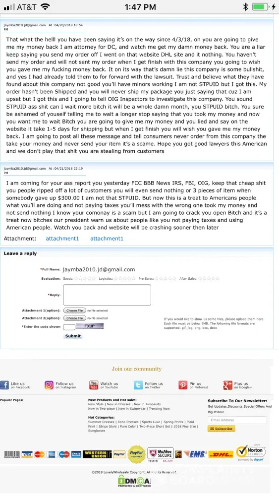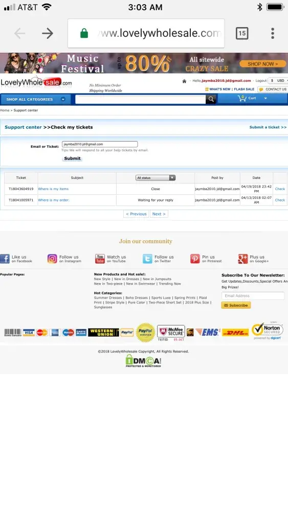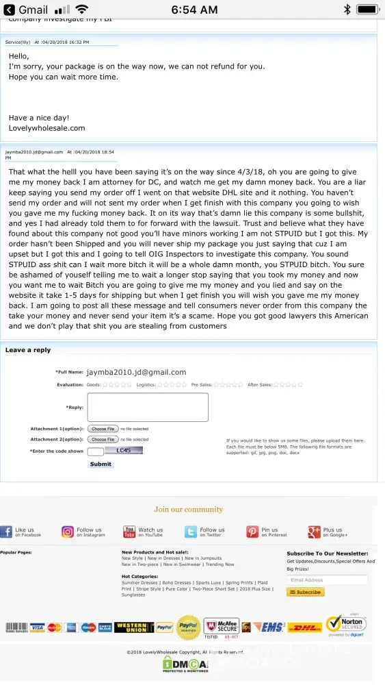 I placed an order on june 1 2018, spent almost $200. After 6 days of hearing nothing I sent a ticket. Well I got a response not to long after in my email box. Could I read the response, of course not. It only told me basically to sign in, and when you do it takes you to tickets but nothing is there for sent tickets. I honestly wish I would have read the reviews on shipping, etc because I would have shopped fashionova. Next clothing hail will definitely not be lovelywholesale... Order #r2018053199000