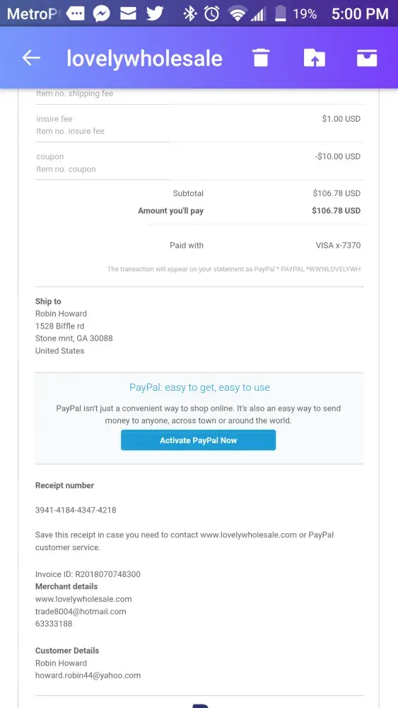 Lovely wholesale don't have a contact number. And I still haven't received my order. My status still say confirmed. The amount went for $18.46 usd to $0.00 usd. And my money isn't on my card.