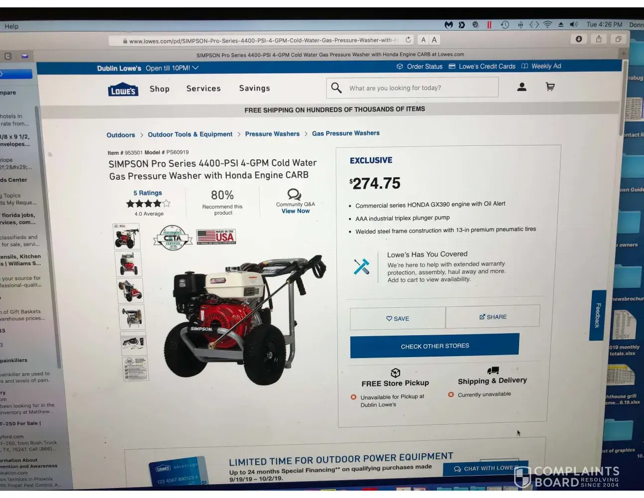 I tried ordering a pressure washer off the internet from their website on Monday 9/23/19. I did not get anywhere with a local search so I called the customer service # 800-445-6937. I talked to Stephen and was told Panama City, Fl had one and he would have them ship it to my local store in Port Charlotte, Fl. and someone will call me back to let me know when we can pick it up. I did not hear back by the following afternoon so I called the above # again. At that time I was told that can't be done and they were sold out but the one that was advertised was Simpson Pro Series 4400-PSI 4 gpm gas washer fr $274.75. At this time with climbing the ladder I talked to Brian and he offered me the same specs on another pressure washer for 10% off of $979.00, model # Simpson 4200-PSI 4 gpm. This is a switch and bait scheme that they are trying t pull. After emailing the CEO, Marvin Ellison on 9/25/19 I get another person Sadie from corporate trying to tell me more or less "too bad". Do not deal with them! They could care less about you! I have enclosed a copy of the internet ad for everyone to see.