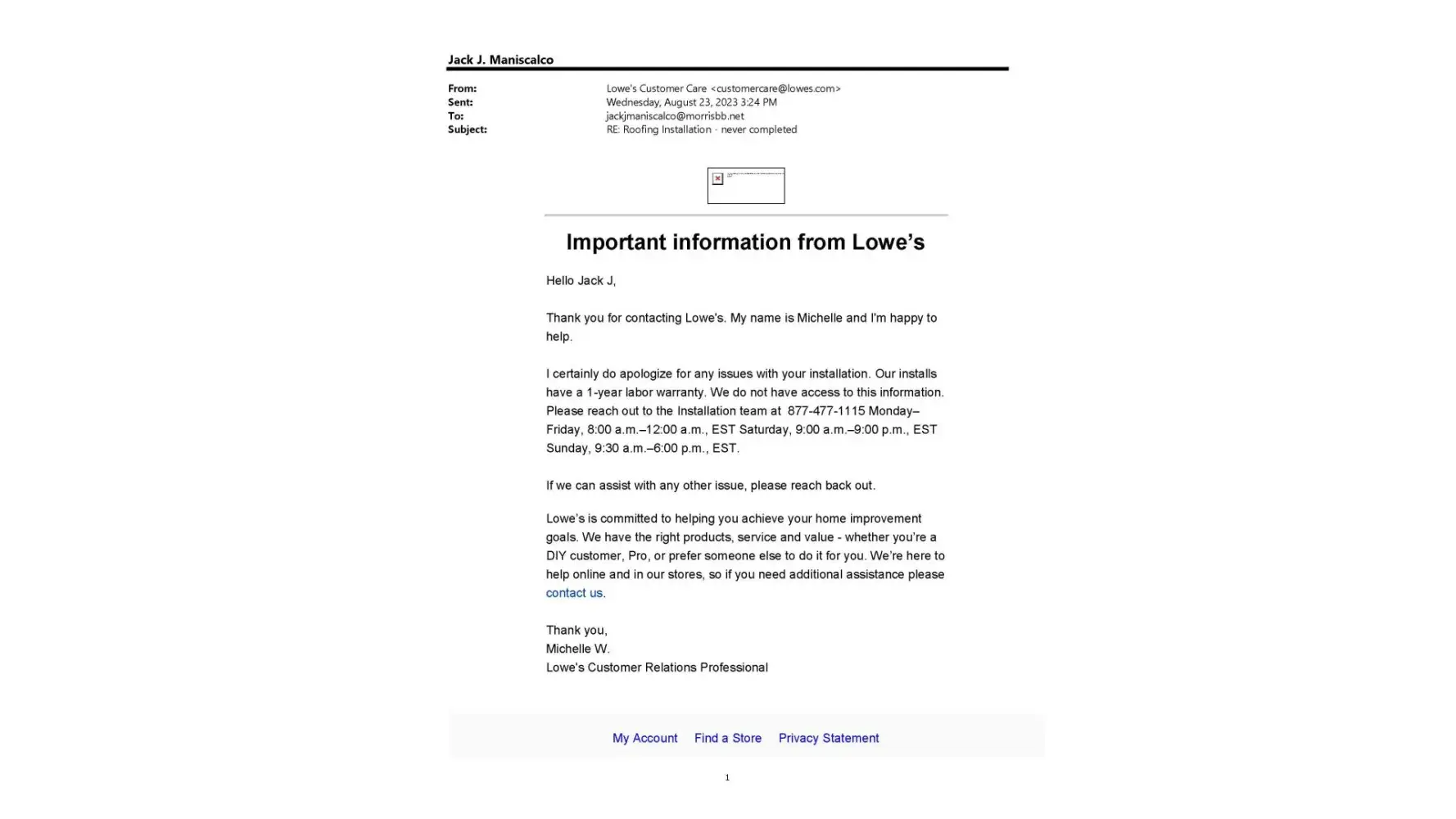 I called the store where I purchased the items and the acted like it was no big deal and stated that it was a third party and not Lowes fault. I told her that the third party represented Lowes. She stated that she would pass the information on, but they don't follow up with you on resolutions.