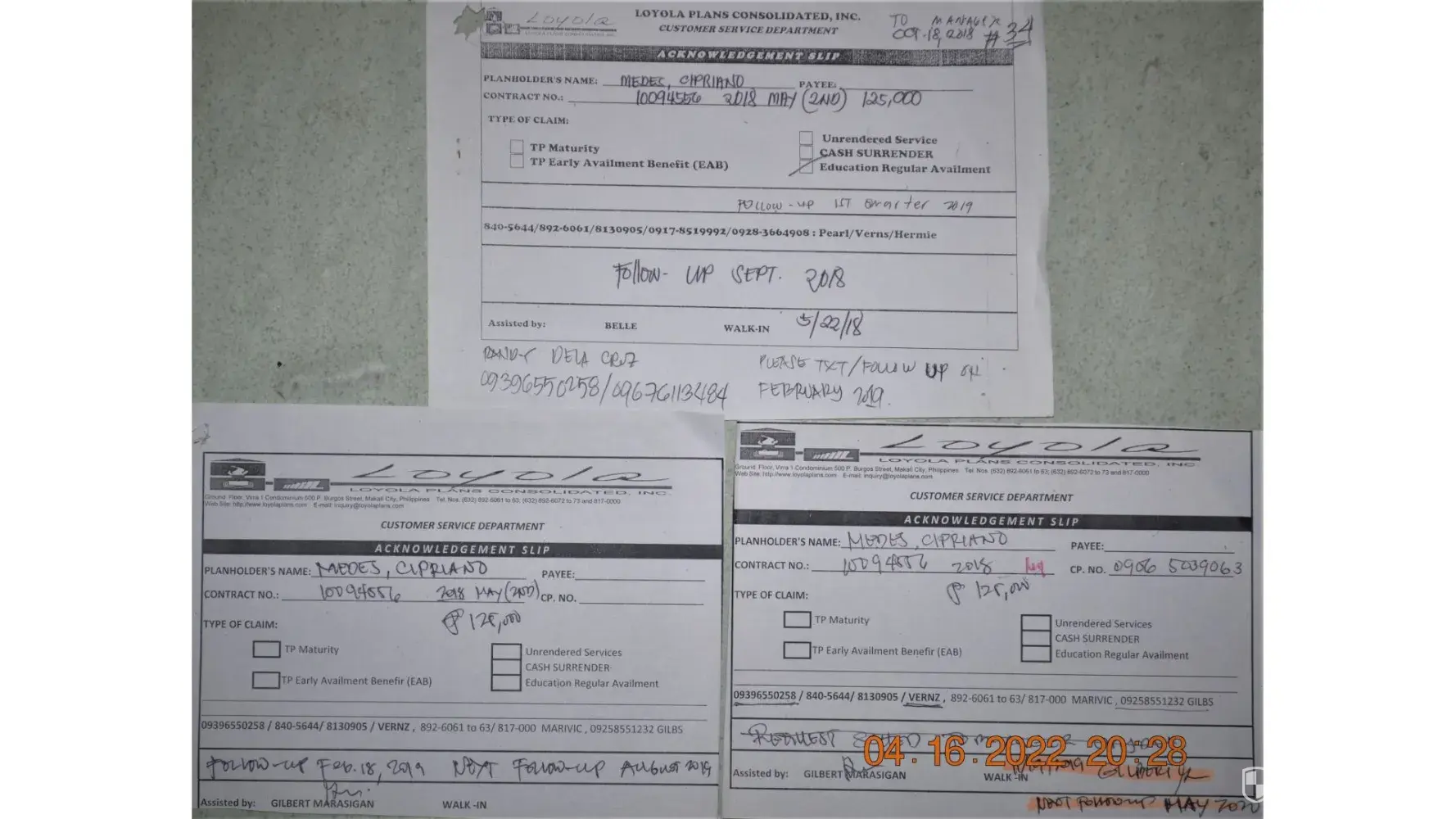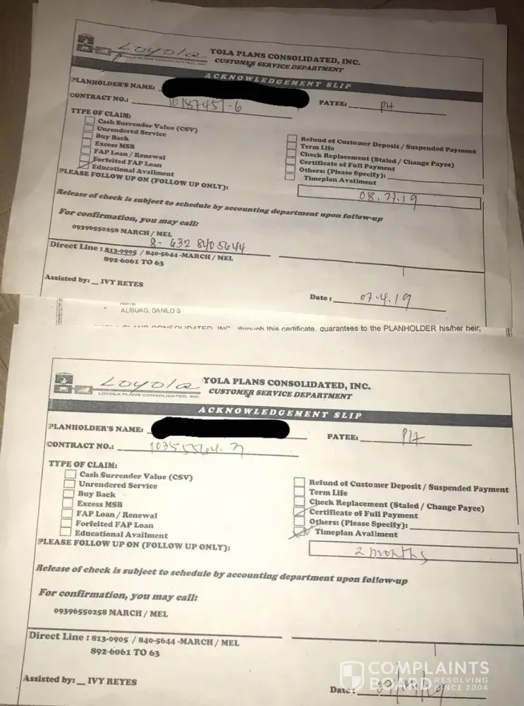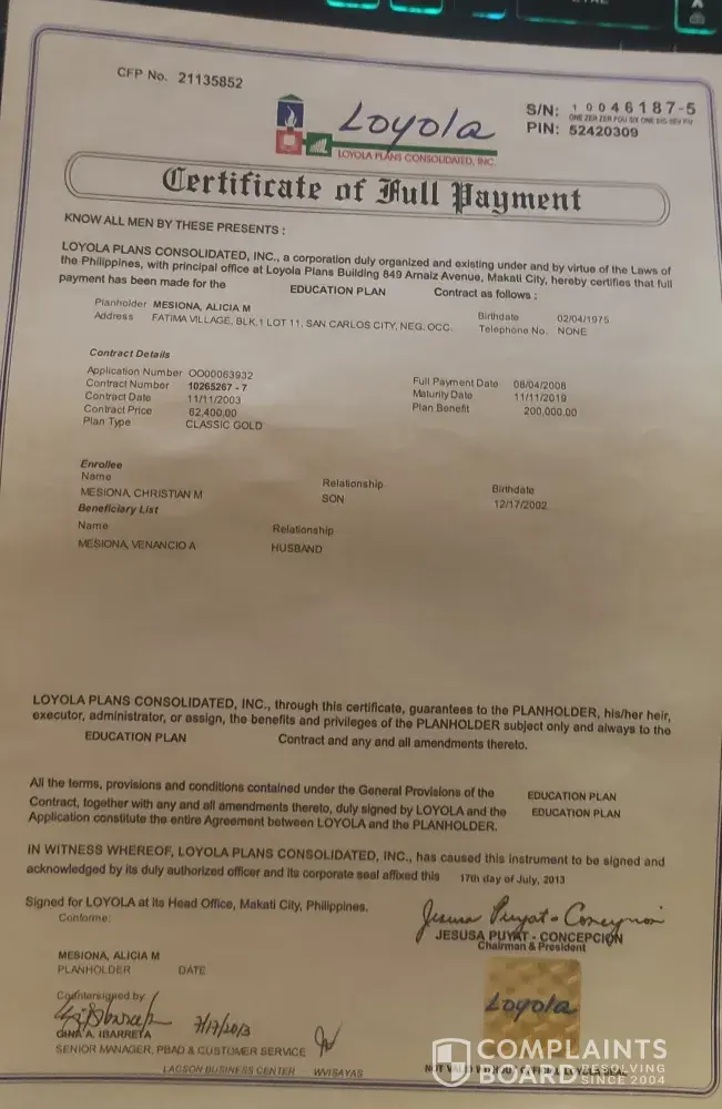 She still has pending claims from Loyola amounting to 225,000 pesos, she was supposed to get 75,000 pesos each year from 2015 to 2018. Since she was able to claim one time on 2015, she still has pending claims for 2016, 2017 and 2018 each amounting 75,000 pesos that we still weren't able to claim. My mother followed up couple of times and even went on their office in Poblacion, Makati to follow up on the payment. But same response was given, Loyola is still in bankruptcy and is still selling properties as of the moment. This is purely unfair and not a valid excuse because we really struggled with money, my mother paid for my education plan rightly. I had to stop my education since we do not have the money that was supposed to be for my tuition. And because of that I am still an undergraduate, I had big dreams ever since I was in high-school and now I am planning to go back to school but we wanted to resolve and get the pending claims from my education plan in order to proceed.