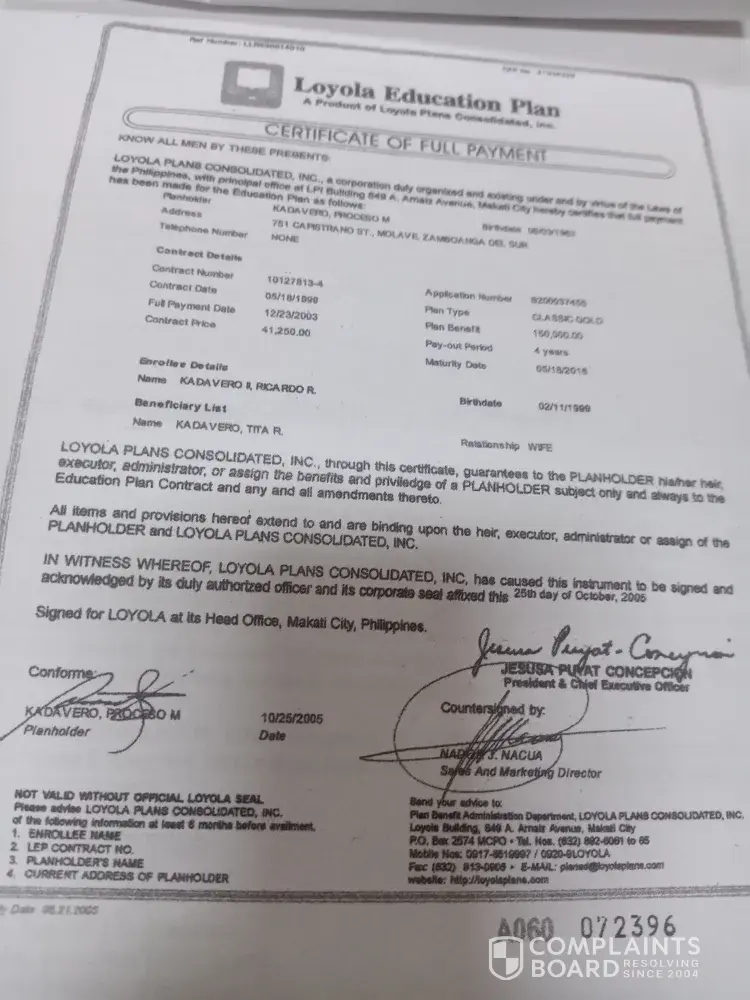 I would like to complain against Loyola Consolidated plan regarding the claim if benefit we file last April 2020 upon maturity if my time plan We already submitted all the required documents including the funeral plan of my mother and verified and agreed by them and told will release the money by that month but until now no answer. The educational plan was not paid fully by the company. I kept sending them email but no reply and the office was closed. I suffered from serious illness and I need the money for my family.