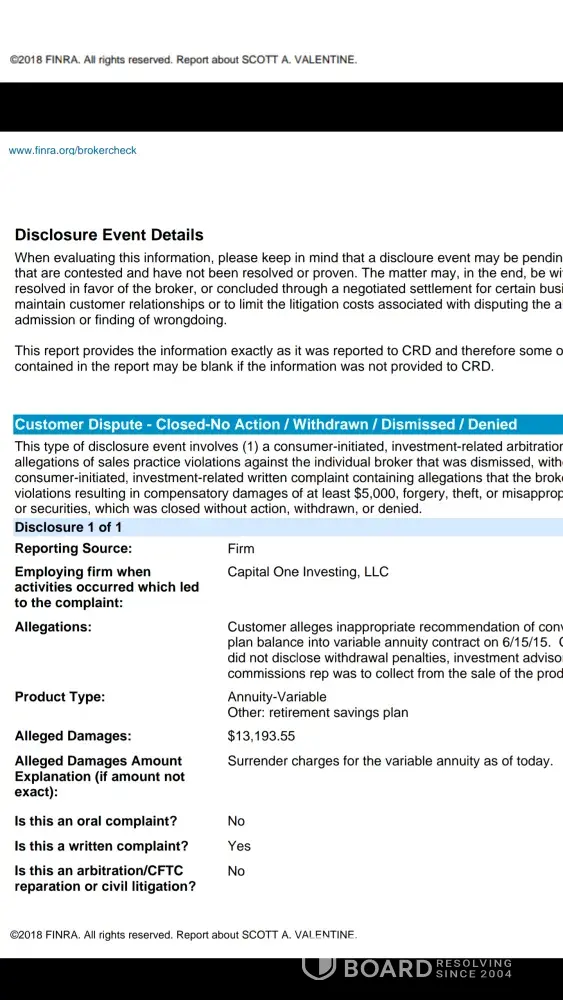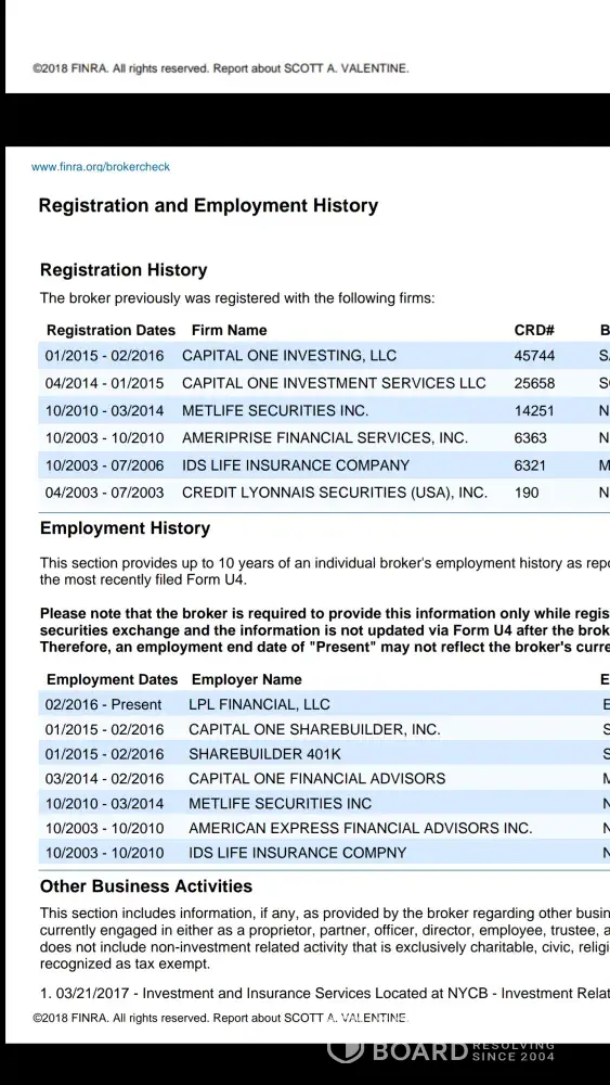 Scott Valentine who works for LpL Financial Inc is out in the long island area selling people retirement plans they don't need! Best of all after he completes a deal with a client he will share there information with his friends and make fun of the client.please investigate online all about Mr valentines complaints, bankruptcy, and his low score with his company.one of the complaints states Valentine forged a customer's name.im going to put a link on here I'm not sure it will come out.just copy it and read.thank you a consumer who got away from valentine. https://app.wealthminder.com/financial-advisors-islandia-NY/scott-valentine/320676