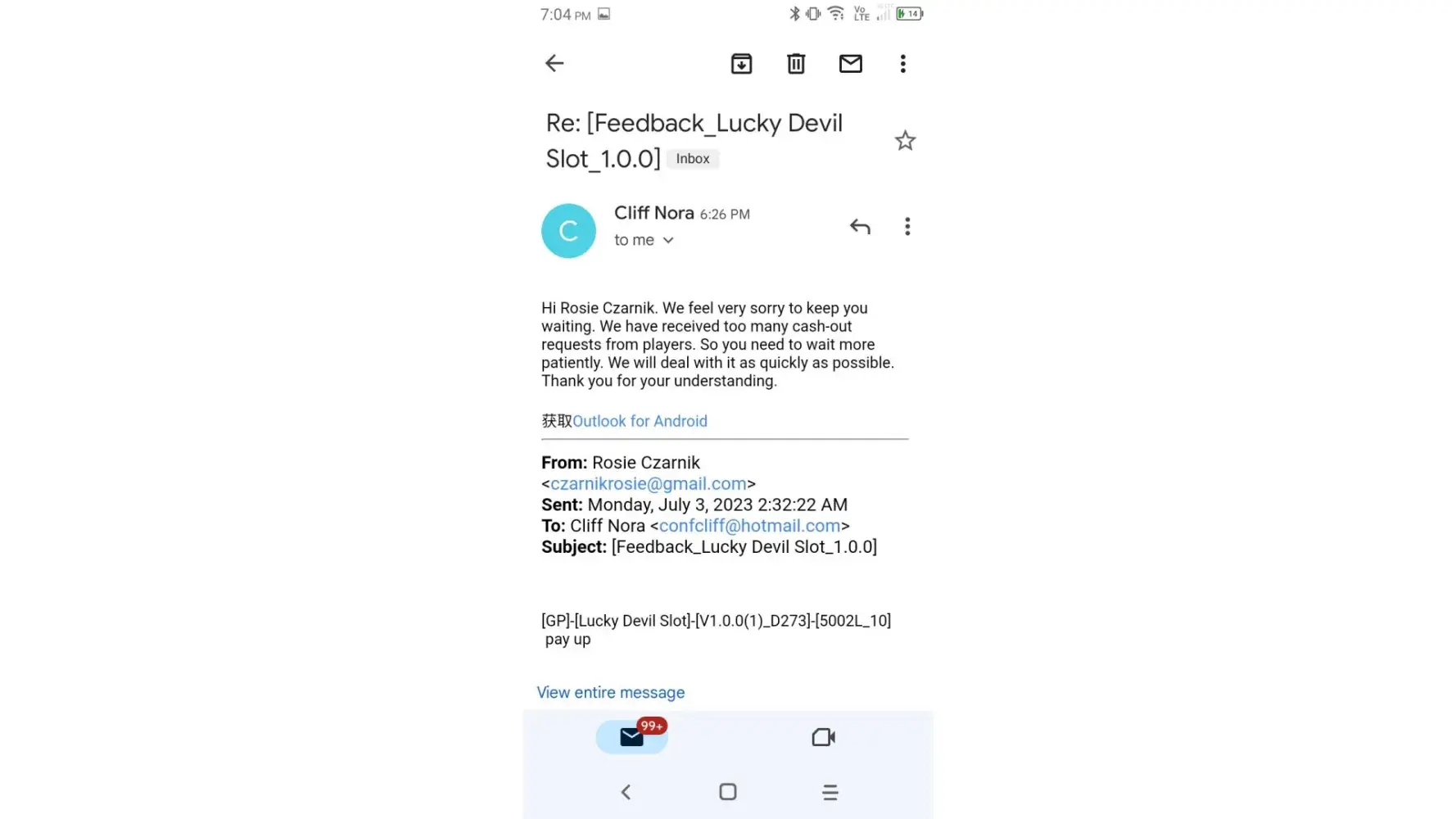 Played Lucky Devil Slots game and other games by this same developer for the last four months that were pending in the queue payable to me but have mysteriously disappeared from my Cash App Account and my PayPal Account I've tried emailing them for the last week numerous times and have not received a reply back I've contacted PayPal and they have no pending payments in the queue waiting to be deposited into my account They do not provide a customer Service Number The total amount due me from Lucky Devil is $10000+