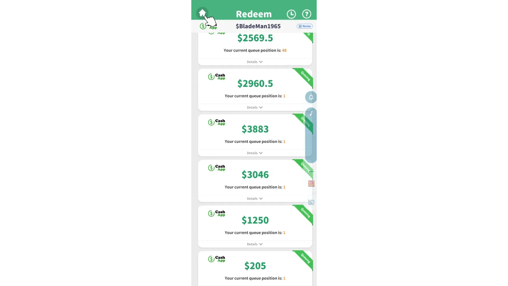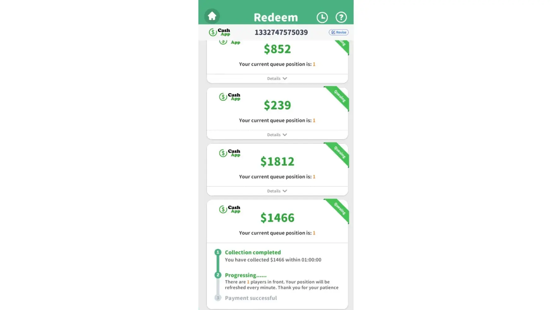 I'm dealing with the same thing. Spun the "required" number of times to "process" the payment then the ads then it said 2 days it would go to my CashApp and now it says I am like 5,518 in then que or some ridiculous number like that.