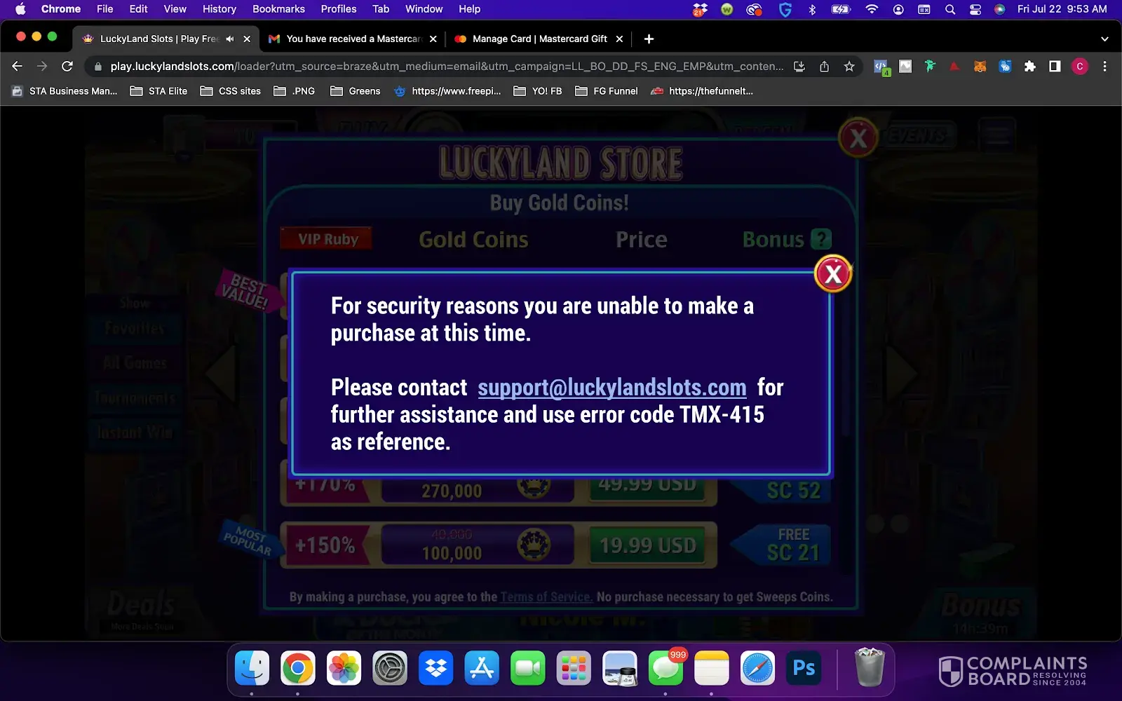 I was hit with the ERROR CODE TMX-415 when trying to purchase Coins on Wednesday and was denied the purchase. It's now Friday, i still am getting denied purchases, and have sent multiple emails to try and fix this issue or get an update and haven't gotten any responses. (i'm still not sure what error code TMX-415 represents or why i even have it). I just want to be able to make purchases again and play Luckyland. Please help.