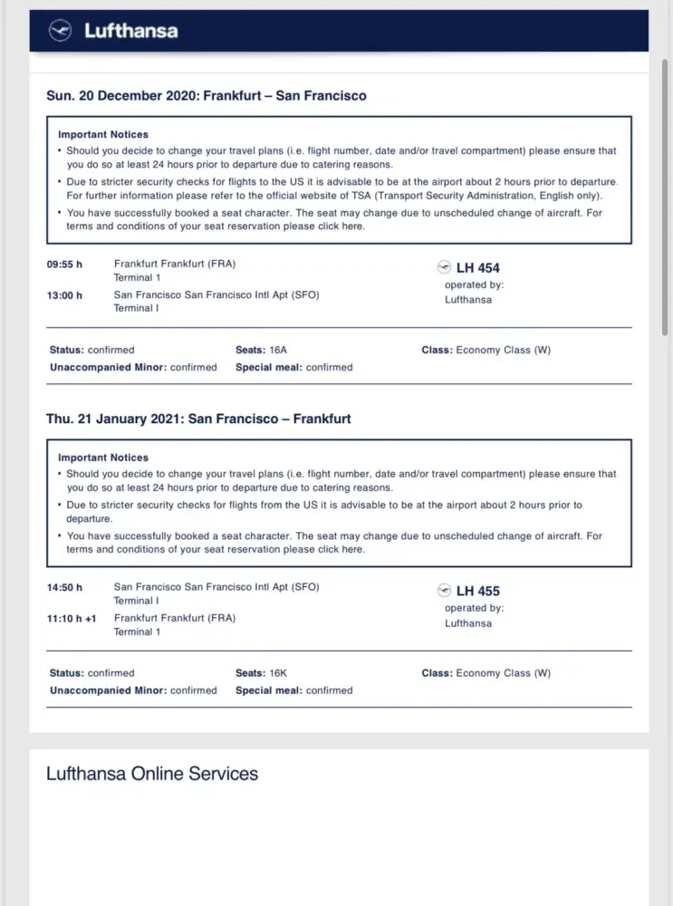I booked a ticket from Munich to Jfk on January 3, 2020 and a return from Jfk to Munich on April 8, 2020.