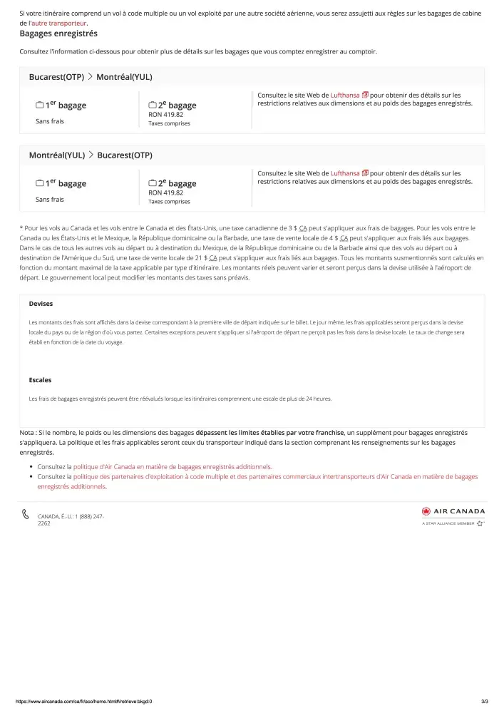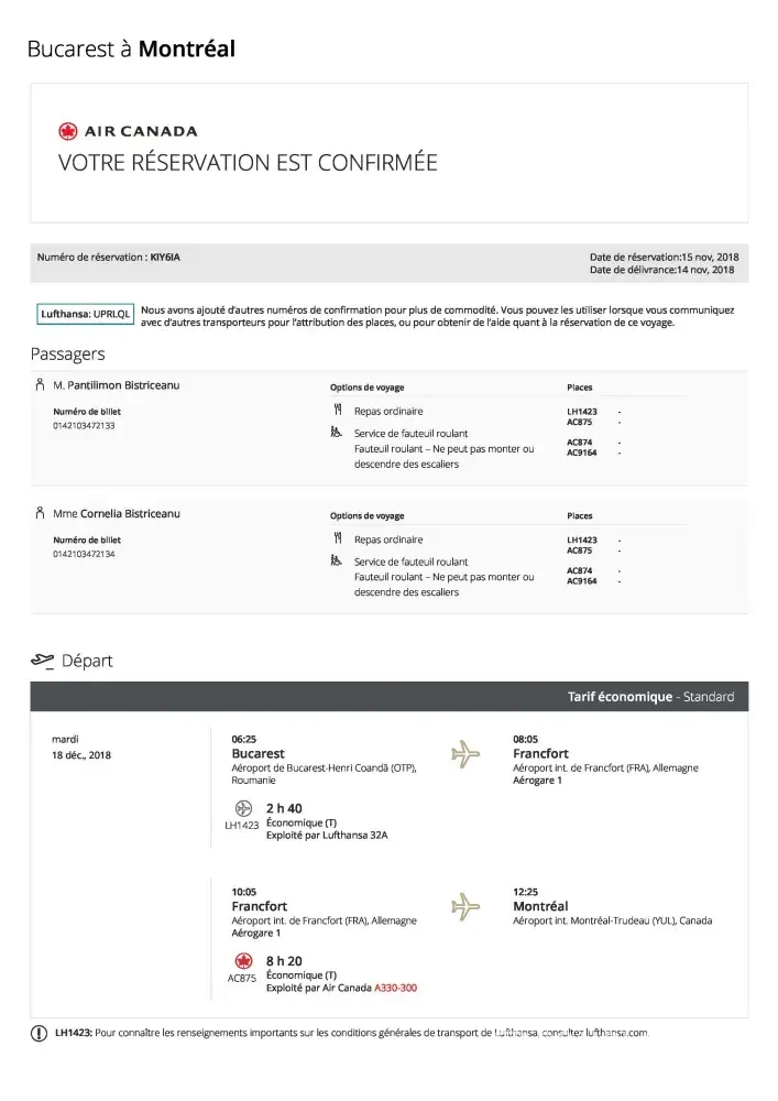 My parents were supposed to leave Bucharest on December 18, 2018 - see booking number Lufthansa UPRLQL in the reservation here up - at 06: 25h with flight LH1423, make a stop in Frankfurt from 2: 40h to fly afterwards for Montreal at 10:05 am with Air Canada flight AC875.