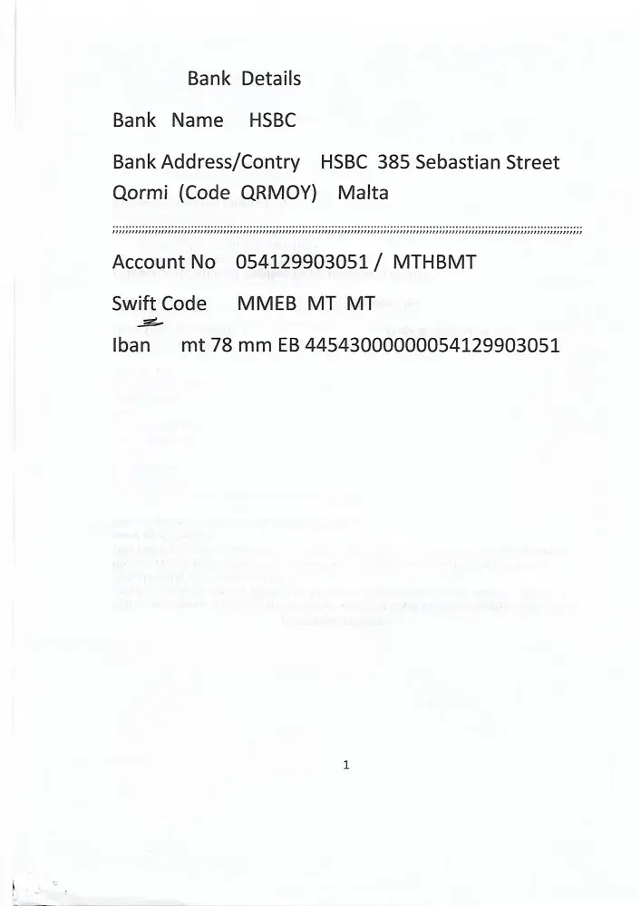 Bank Address/ Country HSBC 385 Sebastian Street Qormi ( Code QRMOY ) Malta