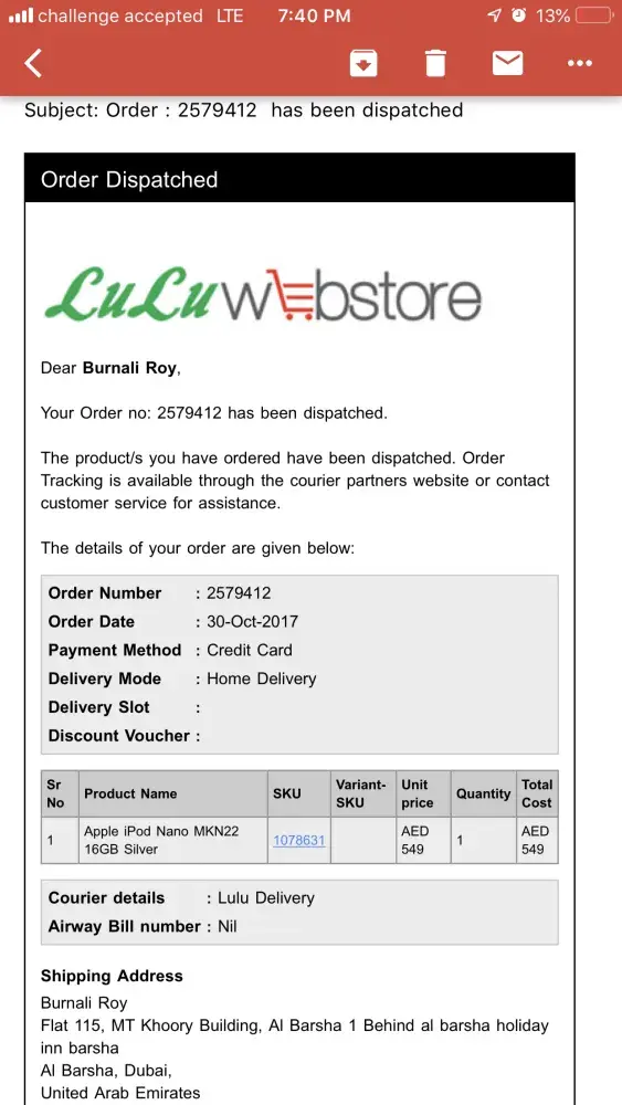 1. At 6:00pm on 14 Oct I received a call from Lulu saying that my item is going to be delivered at 7pm and that I should ensure that there someone at home. No one turned up or even bothered to call to inform about the status until I called Lulu at 10:30pm enquiring about the status. Then I was informed that order is on its was and should arrive latest 11pm. Again nothing arrived and I called Lulu again at 11:20pm. I was then informed that the delivery is "pending". I asked how could it be pending when I was confirmed twice within the same day that item is on its was to be delivered. I was told it's because there was traffic jam in my area. That was completely as there was absolutely no traffic in my area. I said this to the person I was speak with, the gentleman said he will call me back in few minutes. I waited and approx 11:30pm somebody else called me to say that delivery cannot be made until tomorrow. This time the reason wasn't traffic jam, instead, too many deliveries for the delivery guy so he could not deliver my item. I disappointedly agreed to have the item delivered the next morning explaining that my whole evening was ruined since 6:00pm as I had to stay home for its arrival.
