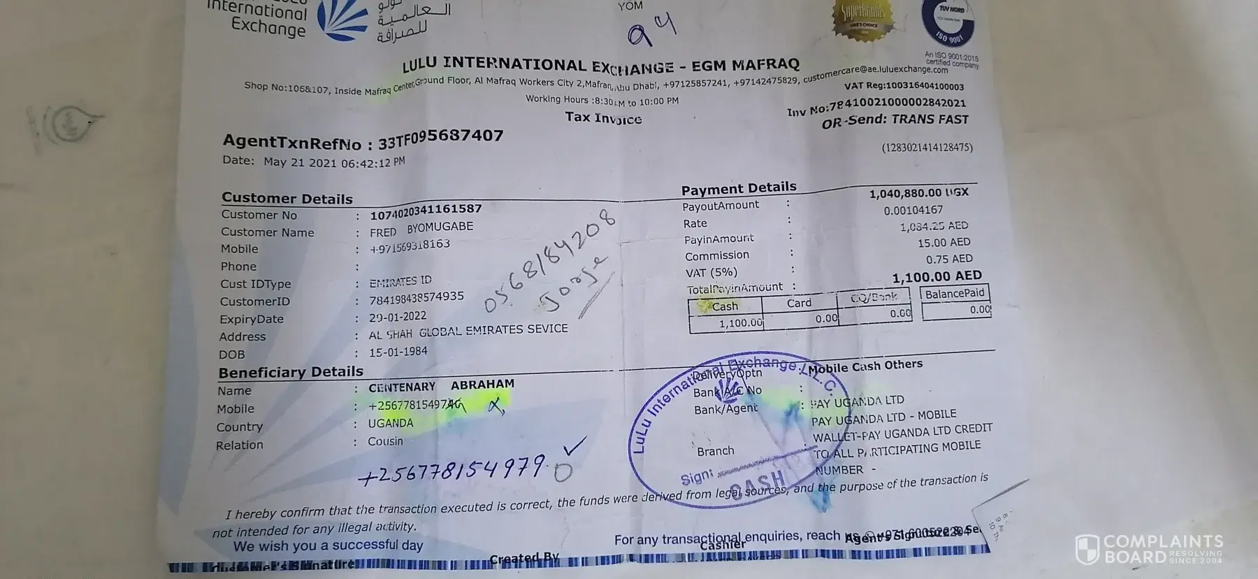 It was on 21st may I was sending money 1100AED to mobile money Uganda with the LuLu exchange agents who came in our camp BGP Liwa, but they made a mistake up to now they have not solved my problem.i was sending to +[protected] in names of Centenary Abraham, but unfortunately the send to+[protected] in the names of innocent opio but I have been calling them every now and then but there is no help thanks.