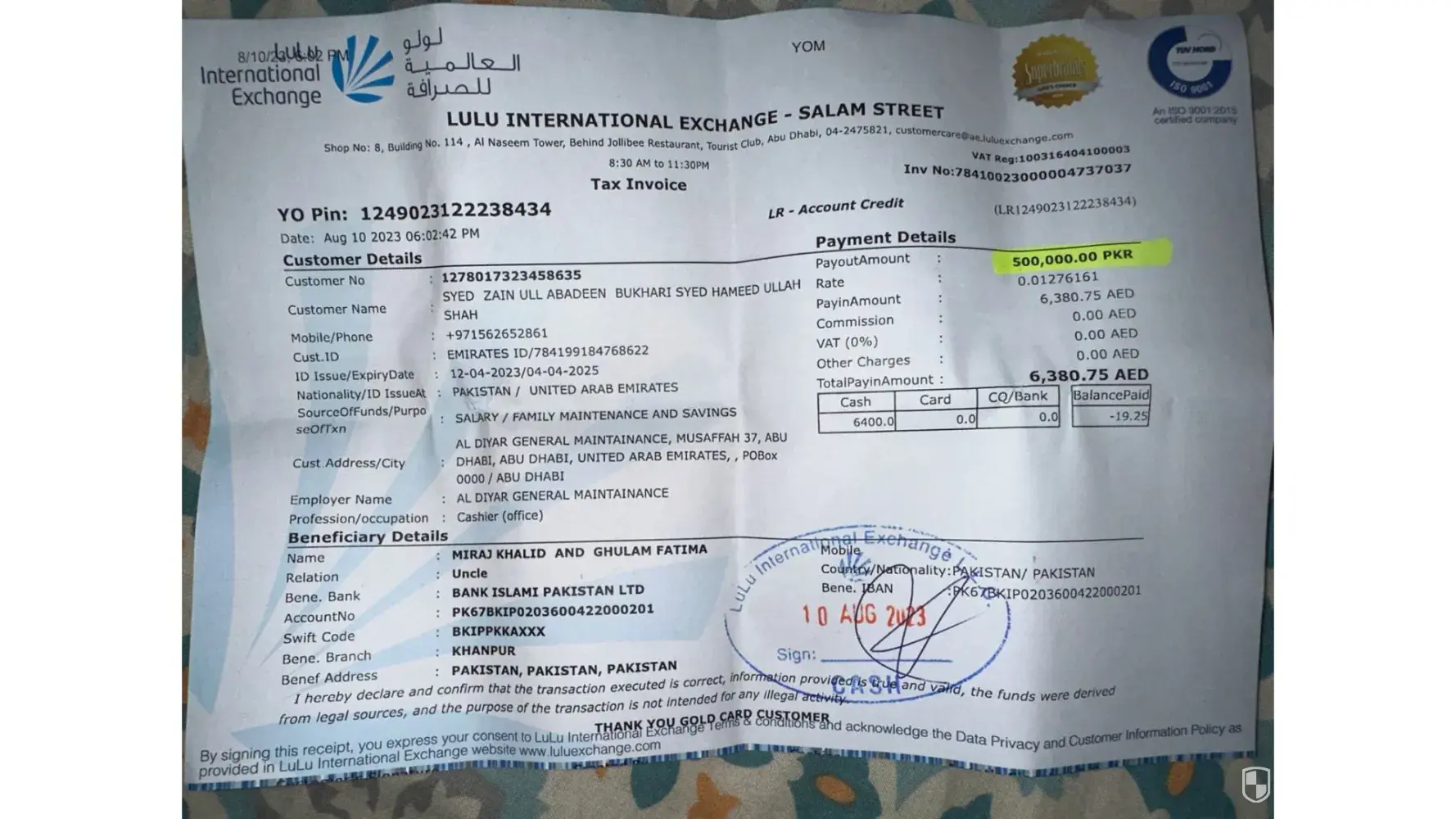 Then he said not allowed to received the money if you don't have Lulu member card, as he said should have the card to receive the money, and the Fees 10 Dirham.