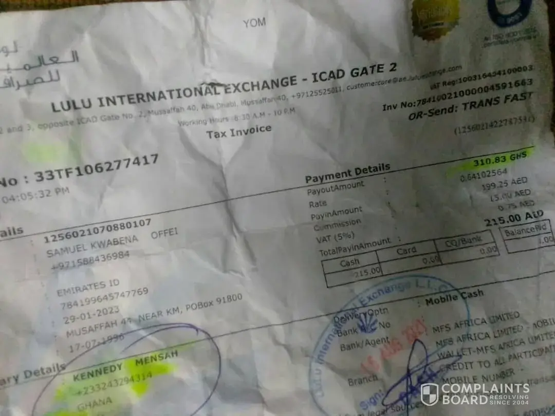 On the 15th August, 2021 amount of money was sent by Samuel Kwabena Offei from Dubai to Kennedy Mensah in Ghana was mistakenly sent to a wrong phone number which is+[protected] instead of+[protected]. After I was informed of the incident I quickly contacted my network carrier and informed them of what has happened, fortunately my network carrier which is mtn Ghana was successfully blocked the user from redrawing the money. And proceeded reversing the money back to LuLu.