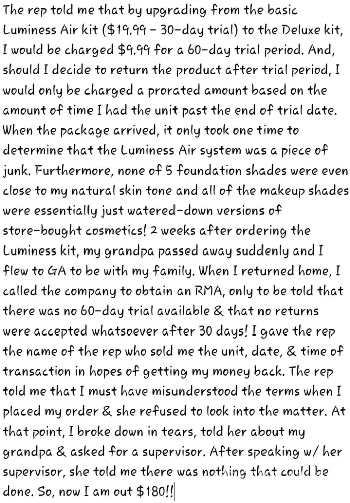 Number one I LOVE my Luminesse Airbrushed makeup and they are NOT lying if you pay attention to the information presented in the infomercial. They send it to you and tell you they will start billing you but IF you call within the 30 days, it's your job to call them to get the return info and they WILL credit you back all money auto billed to your bank account. If you like it then you pay auto billed for 5 more monthly payments and it's yours paid in full. Their makeup is hypoallergenic not full of harsh chemicals that damage your face like the ones you buy at Walgreens or even Macy's. Your hands aren't touching your face, the makeup is water based and you're not having breakouts from dirty brushes that harbor germs. Makeup artists in Hollywood use airbrushing all the time. Luminesse truly does make a huge difference in the appearance of my skin. Owned one year and haven't had a breakout yet. Customer Service is great. If there is a problem they will even send out another product to try if the color is wrong when you receive it. And the reason you are getting billed monthly for makeup is because like other companies you have to call and tell them you don't want to be in the makeup club they have that auto ships you your makeup every month. I did and it wasn't any trouble at all. The only thing I think they need to do is check with their labeling of products in the warehouse as I have received colors of eye shadow that weren't the same as online. They are looking into that now because I as a pleased customer called to report that and they replaced my products free of charge as I'd already paid for them. So thank you Luminesse for being a great company who truly cares about making women beautiful 💖🌸Michelle B.