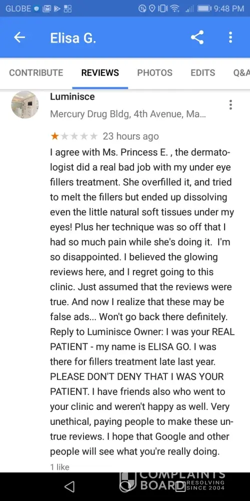1) Luminisce promised my scar would be gone but failed to do so. Kaycee Reyes even showed a picture of a client with very big and very deep scar, and managed to eradicate it in just a few sessions. I thought of "photoshop" but then trusted her and her clinic well that I tried the service out. I paid almost P30, 000 or 30k but the promise was broken. The scar is still on my face.