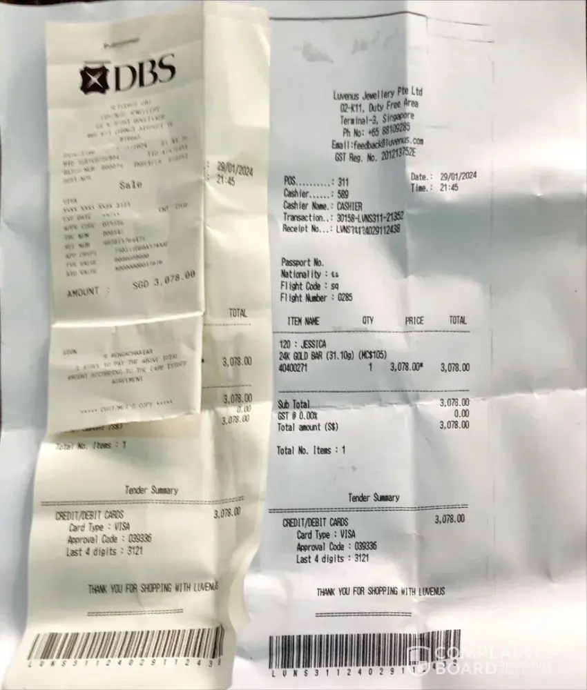 On 29 Jan 2024 around 9.30 pm, we bought Suisse 1 Ounce Fine gold from Luvenus WZE (jewellery) at Singapore Changi AirportTerminal 3, before our flight from Singapore to Auckland for $3,078. We selected Legend of the Azure Dragon of the Lunar Legend Series, since it was a special one and insisted on that piece only. They said there was only one piece and collected the full price without any discount on that when asked for. Salesperson packed the item in the small paper pouch which had the dragon picture on top and seems to have quietly switched over the dragon piece to yet another normal one without our knowledge. After our arrival at Auckland, NZ we noted that the Dragon picture piece was changed over to the other one without our approval and knowledge, though we specifically insisted and bought – paid for the piece with dragon picture only.