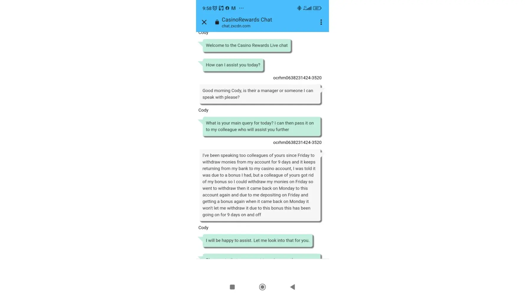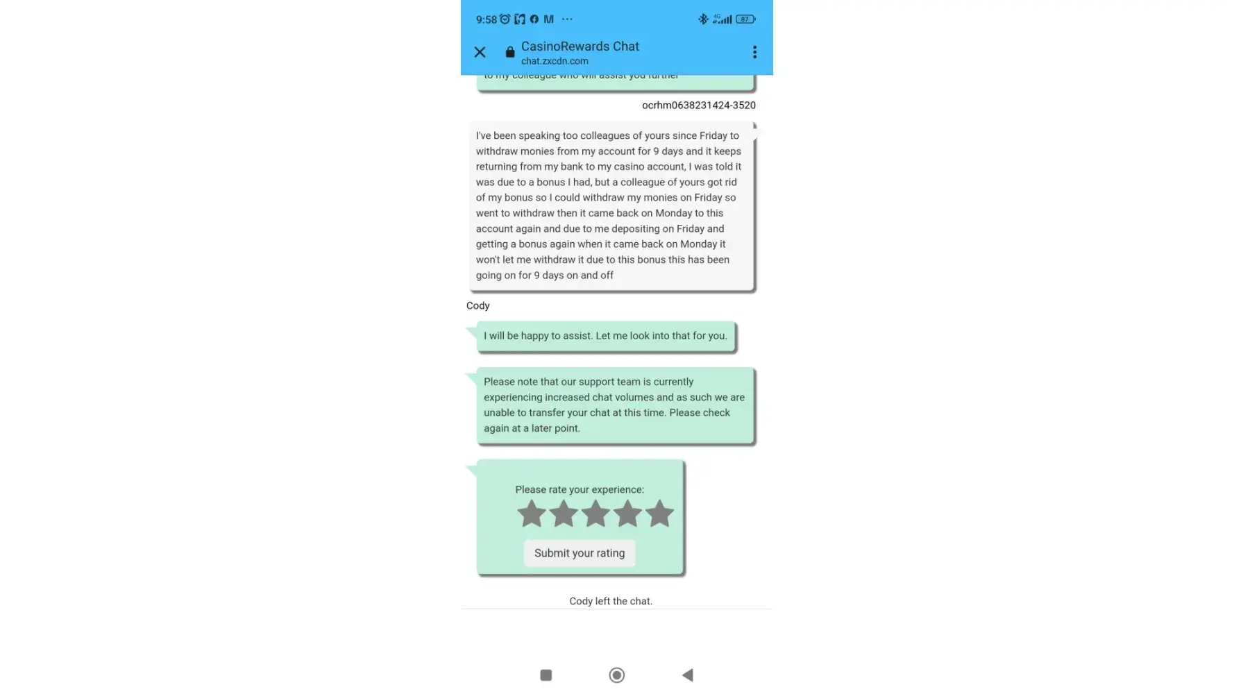 I also suspect some of their games are rigged. When I played there, I noticed that when I tried stopping the reels they would always quickly bypass anything good like scatters and give me a horrible spin. I'm unhappy with their service and treatment of me so far.