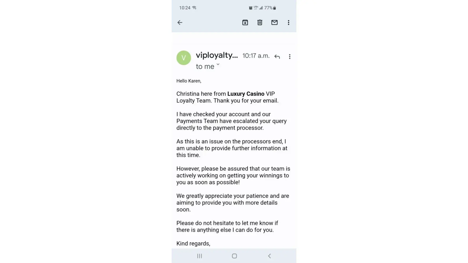 I withdrawal money from luxury casino into my skrill account and it's 72 hours now I have received nothing and there is nothing showing on my id on luxury casino no information regarding my transaction there should be customer commitment as money value to us we are spending